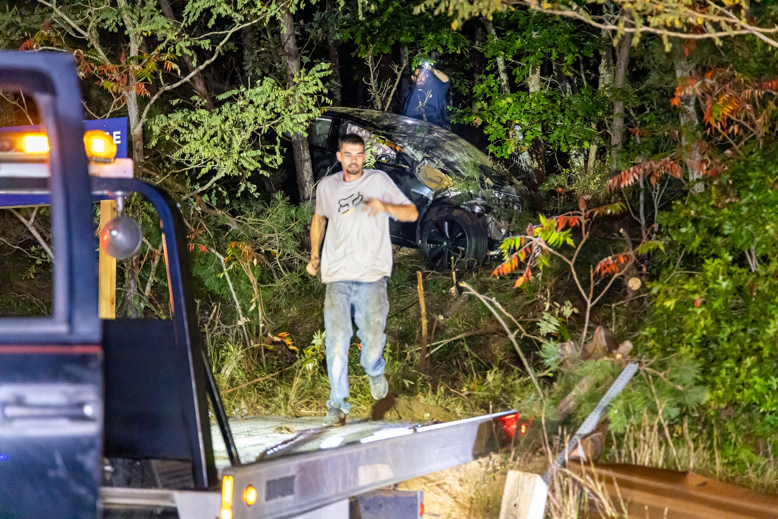 HN PHOTOS: Driver suffers serious open ankle fracture after barreling through guard rail into woods…