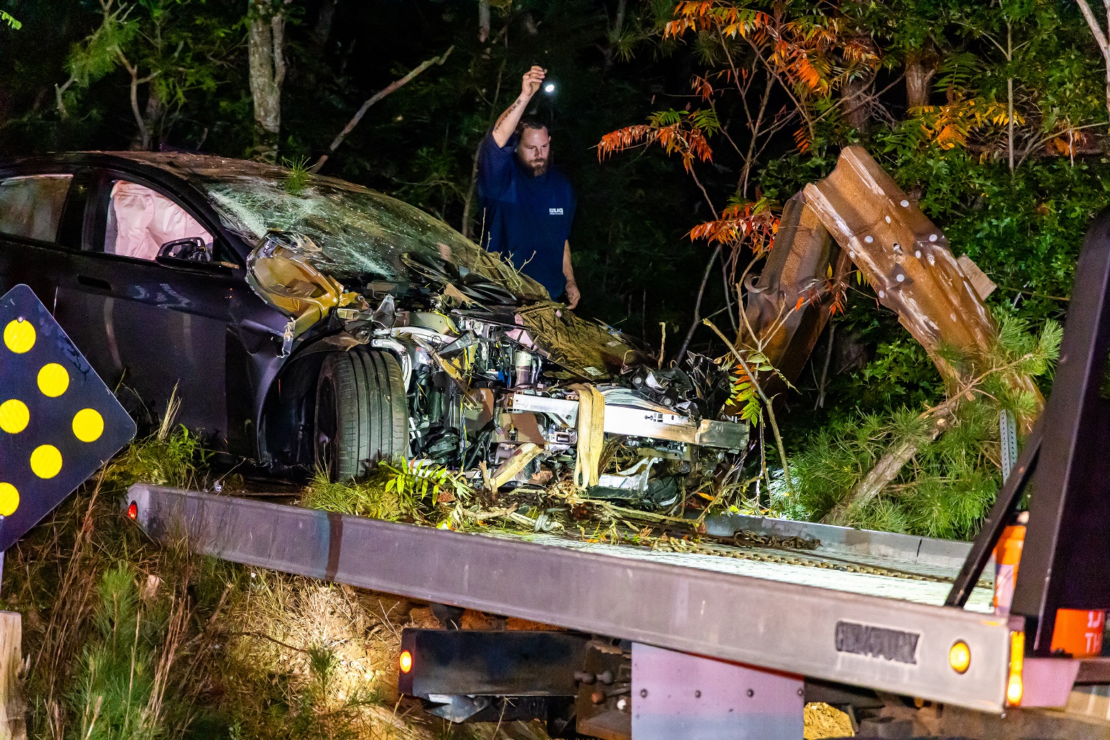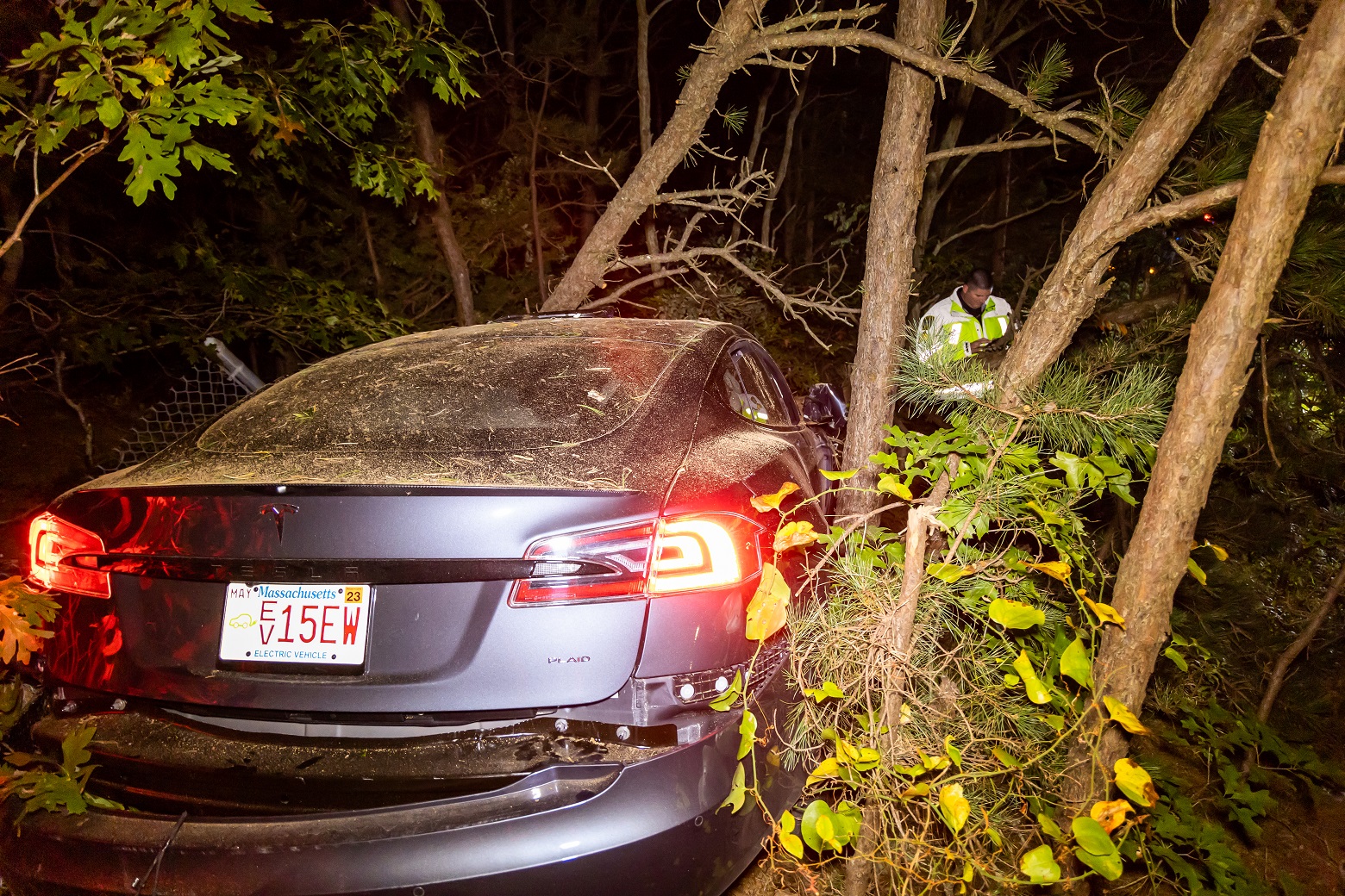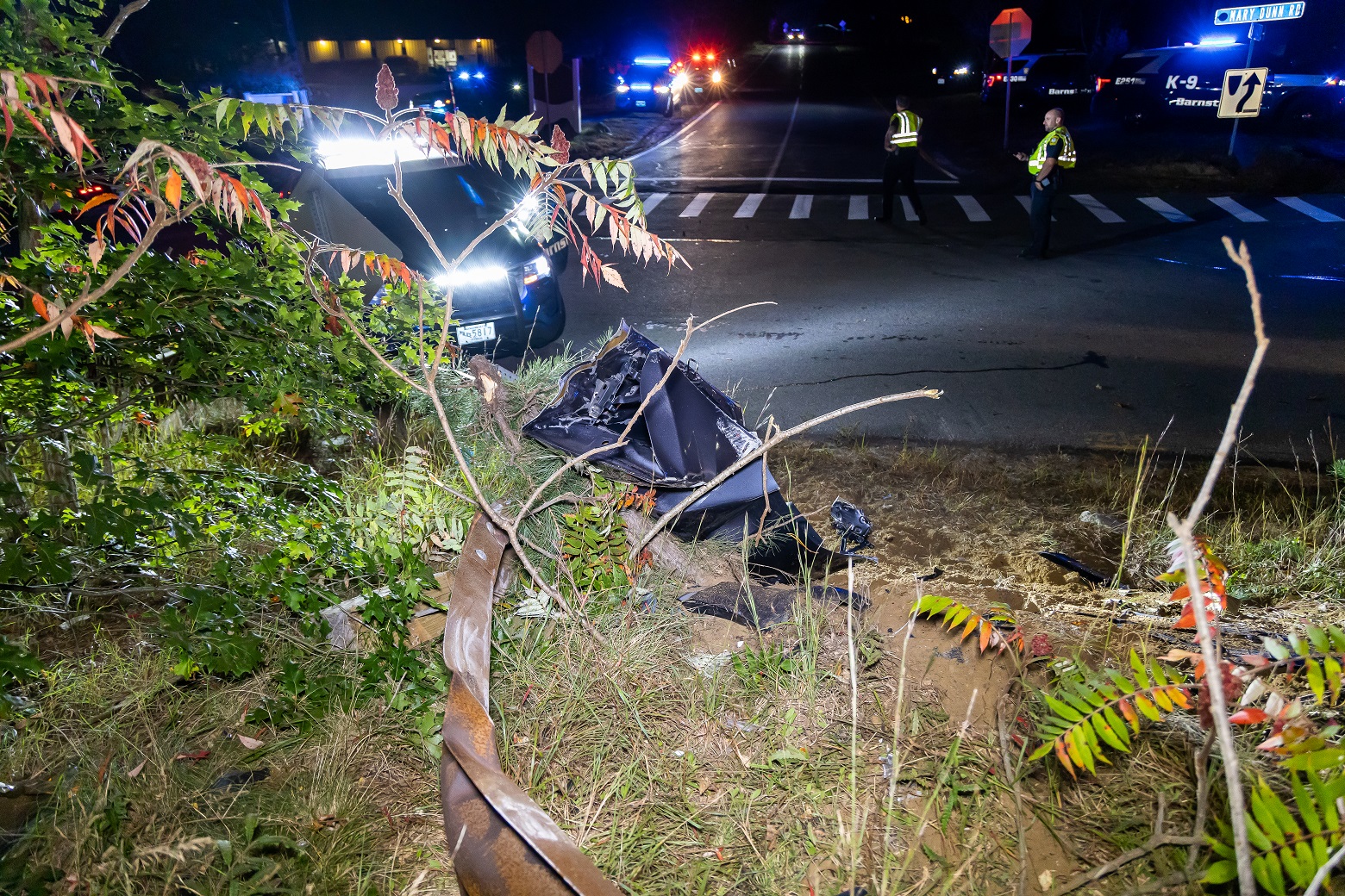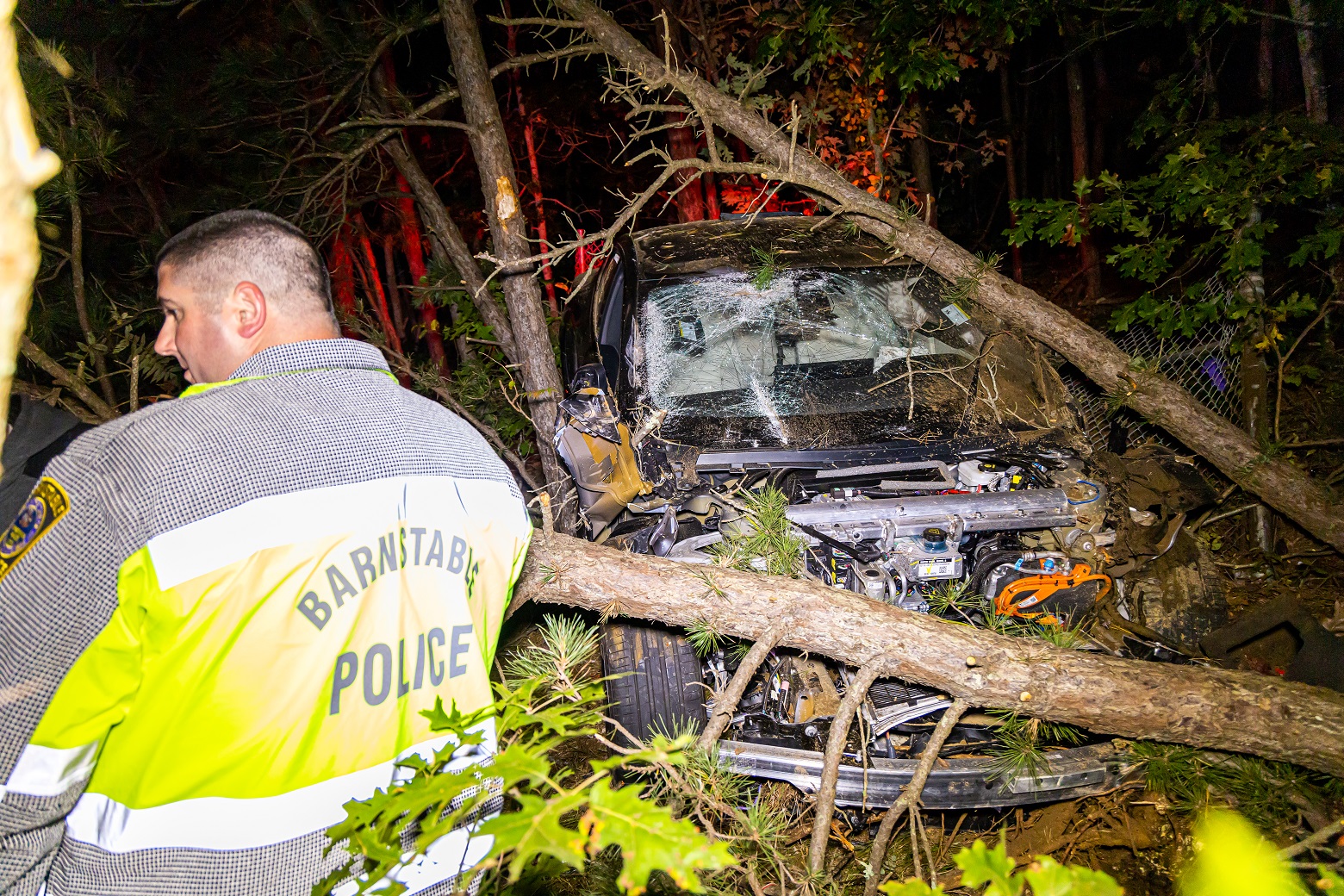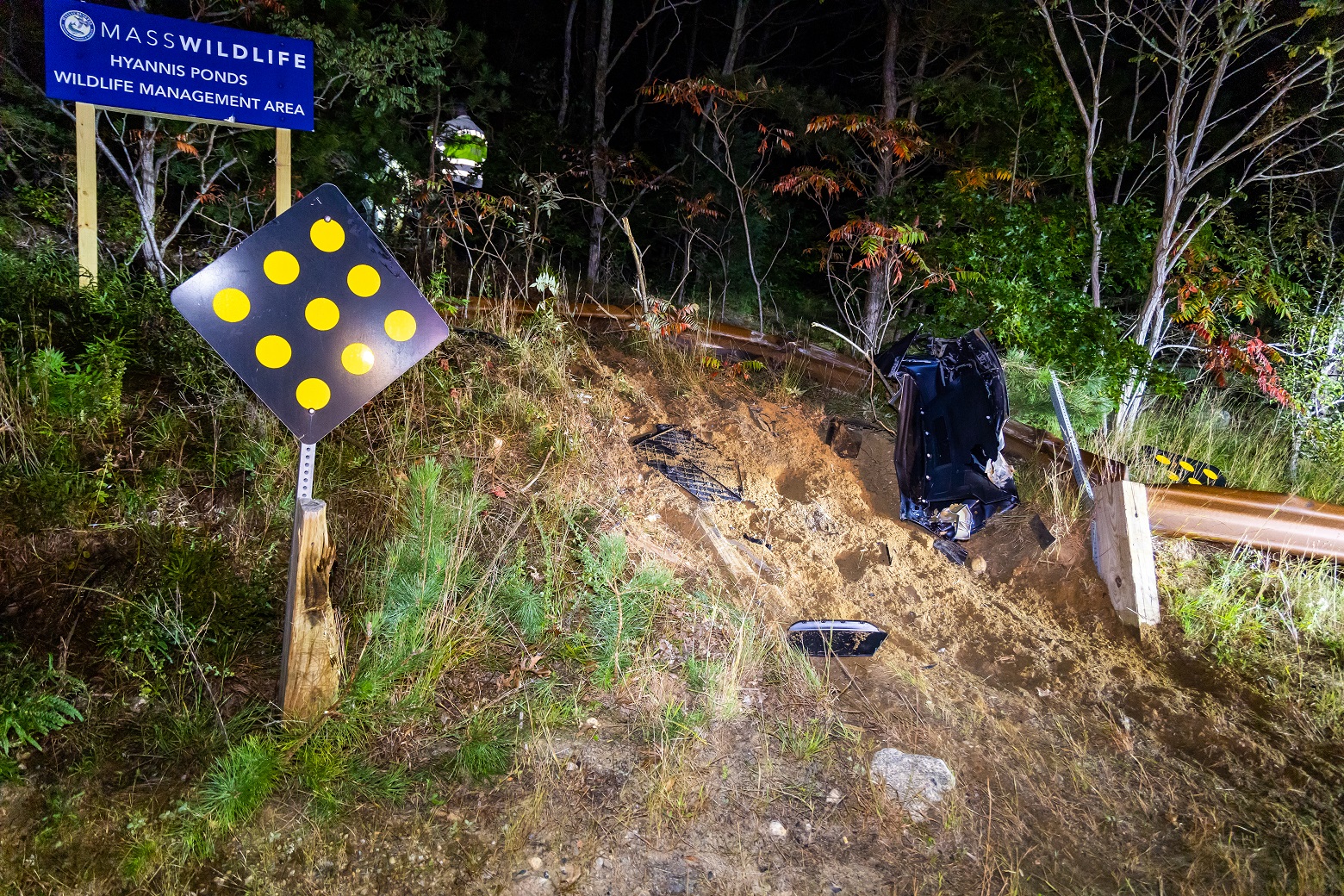 BARNSTABLE – A driver suffered serious open ankle fractures after crashing his electric-powered Tesla through the guardrail at the intersection of Independence Drive and Mary Dunn Road at around 9:00 p.m. this evening. He was the only occupant inside the vehicle.