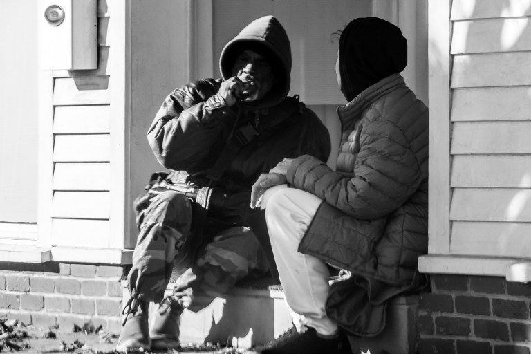 [HN NOTES & THOUGHTS ON HOW WE LOOK AT PHOTOS] “What are friends for?” I asked myself as I snapped the [below] tender moment between obvious friends. This gentleman appears to be thoroughly enjoying a cigarette he’d been passing back-and-forth to the woman who had just stopped by for a brief visit. The welcoming dry weather, along with the sun baking down upon the downtown Hyannis doorway made for a warm, peaceful photo; one representing companionship and sharing between friends, in the traditional “Hytown” sense…