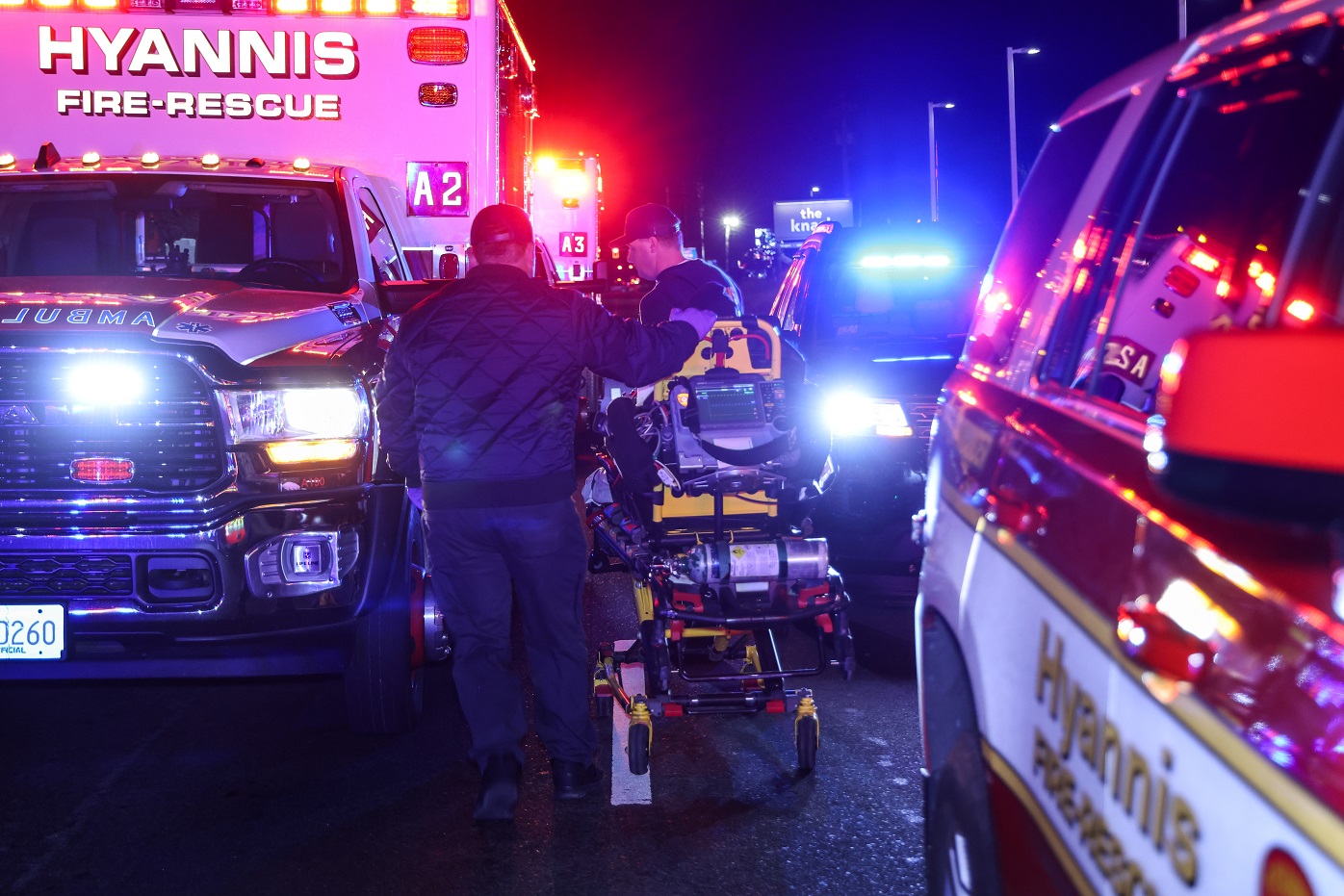 Shortly before 9:30 p.m. Saturday evening, multiple Barnstable Police squad cars and three Hyannis Fire Department ambulances responded to a two-vehicle crash on Route 132 at the entrance to the Festival Plaza in Hyannis. A total of three patients were transported to Cape Cod Hospital with injuries not believed to be life-threatening. HN spoke with the two female occupants of one of the vehicles. They had initially walked away from the scene and stood about 50 yards from the intersection, appearing confused. They spoke briefly with HN in broken English and Creole, asking something indiscernible — something about them having had the green light. A patrolman later spoke with the women, apparently explaining that they would have needed a green arrow at this particular intersection. They looked worried. The officer reassured them that it was an accident and that they would eventually be free to leave (in other words, they wouldn’t be arrested). HN photographed a sign that apparently read, “LEFT TURN YIELD ON GREEN.” It was difficult to read, as some of the black lettering was missing. The patrolman told the women he would look into possible video footage of the crash. The women were cooperative and polite. It remains uncertain who is “at fault” in the particular traffic accident. The Barnstable Police Department is investigating the cause of the crash. Traffic was temporarily diverted around the area while responders worked the crash scene.