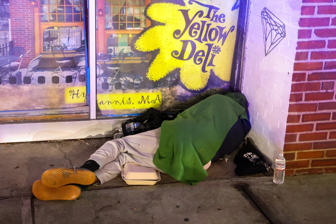 Above HN photo: A homeless man sleeps unnoticed with bar patrons wandering by… amidst a loud commotion, where police officers were investigating reports of fighting just footsteps away, outside of a downtown Hyannis bar early Saturday morning…