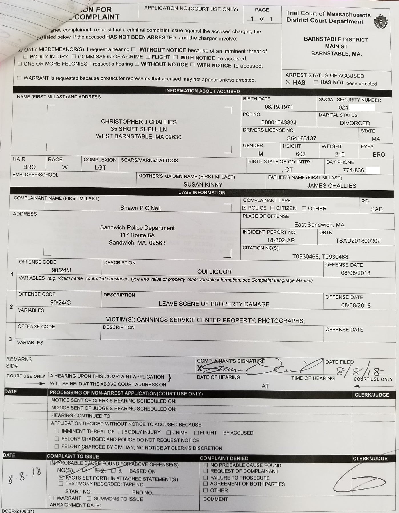 BARNSTABLE – As you will see in the following HN Video and court documents, former Barnstable Police Sergeant Christopher Challies was ordered to house arrest after charged with his second OUI within the past year.