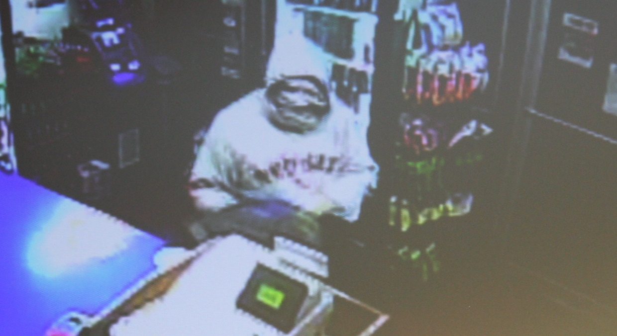When the robber entered, he was wearing his hood and had the rest of his face covered with the white t-shirt, witness(es) could only see his eyes.