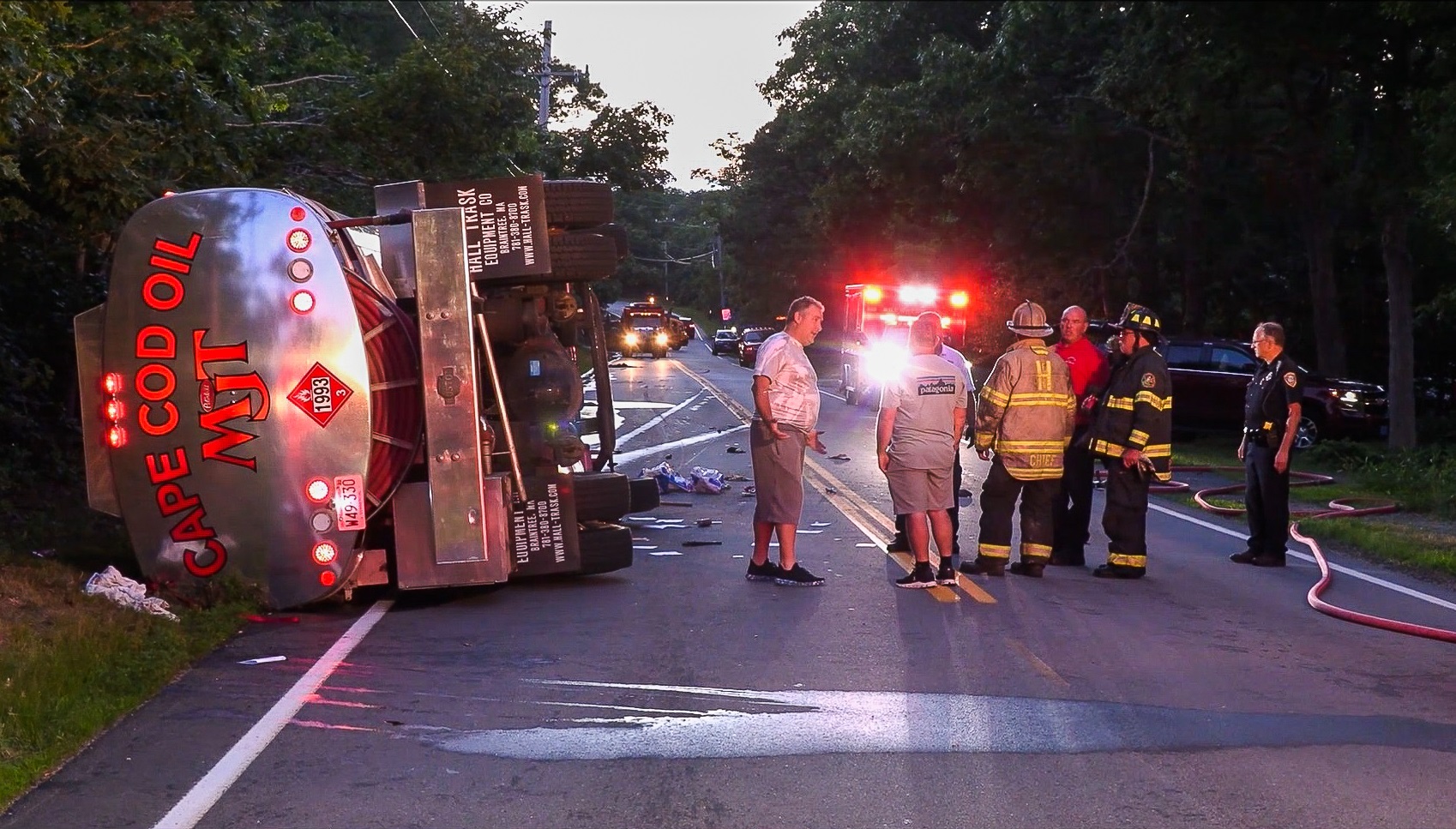 BREWSTER – A home heating oil truck rolled onto its side on Route 137 near the intersection with Old Long Pond Road this evening at around 7:40 p.m. The driver was entrapped for a period of time and needed to be extricated from the wreckage. The tanker began leaking a large amount of oil that streamed down along Route 137 toward the North. Route 137 remains completely closed down at this hour and will likely remain closed throughout the evening as a Tier 1 Haz-Mat operation is underway…