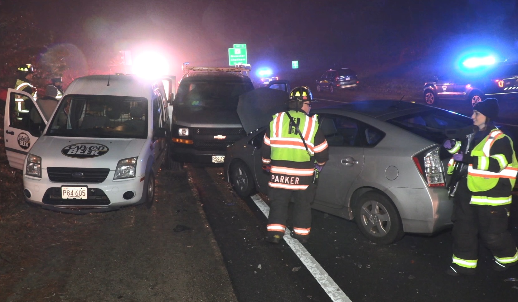 HARWICH – At about 6:15 p.m., police and firefighters responded to Route 6 between Exits 10 and 11 for what was initially described as a head-on collision involving 3 vehicles with multiple possible patients. The crash fortunately turned out to be not as bad as it could have been. Seven patients were evaluated with only one person needing to be transported to Cape Cod Hospital for injuries not believed to be life-threatening.