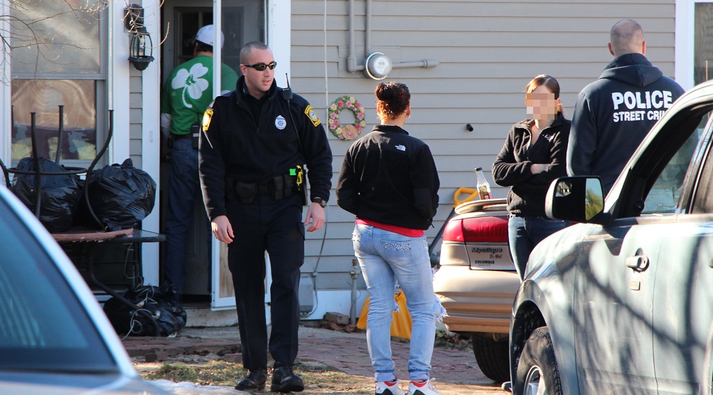 A resident was on the line with police reporting that two young women were kicking in her back door.