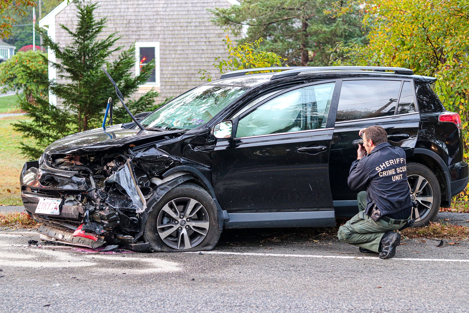 CENTERVILLE – Five people (two who appeared to be teenagers) were transported Cape Cod Hospital after a head-on crash on Old Stage Road near the intersection with Nottingham Drive shortly before 7:00 a.m. this morning. Both vehicles were heavily damaged and remained in the roadway as five separate ambulance crews responded to the scene. Barnstable Police shut down traffic in both directions as EMTs and a Barnstable Sheriff’s photographer worked the scene. Of the five transported to the hospital, two appeared to be teenagers/school age. All patients were conscious and alert… and injuries were not believed to be life-threatening. It took first responders the better part of an hour to reopen the roadway. The following HN Video highlights the scene shortly after the first police and firefighters arrived on scene…