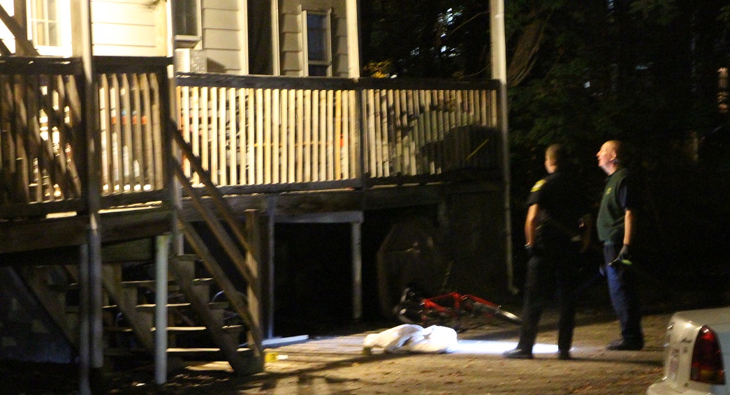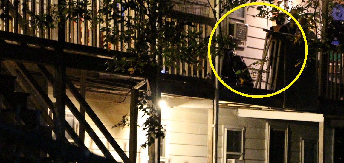 Officers arrived on scene and found the victim, a 34 year old male, laid out on the asphalt parking lot below the two and a half story deck.
