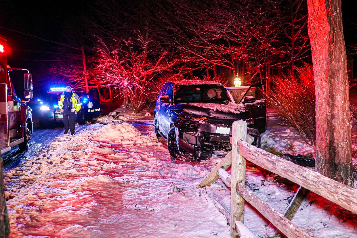 At about 9:30 p.m. – 2/18/21 – Barnstable Police and Cotuit Rescue responded to the area of 1135 Old Post Road for a single vehicle crash into a tree.