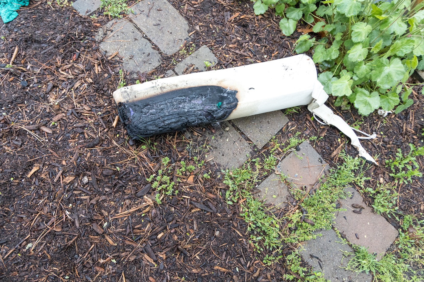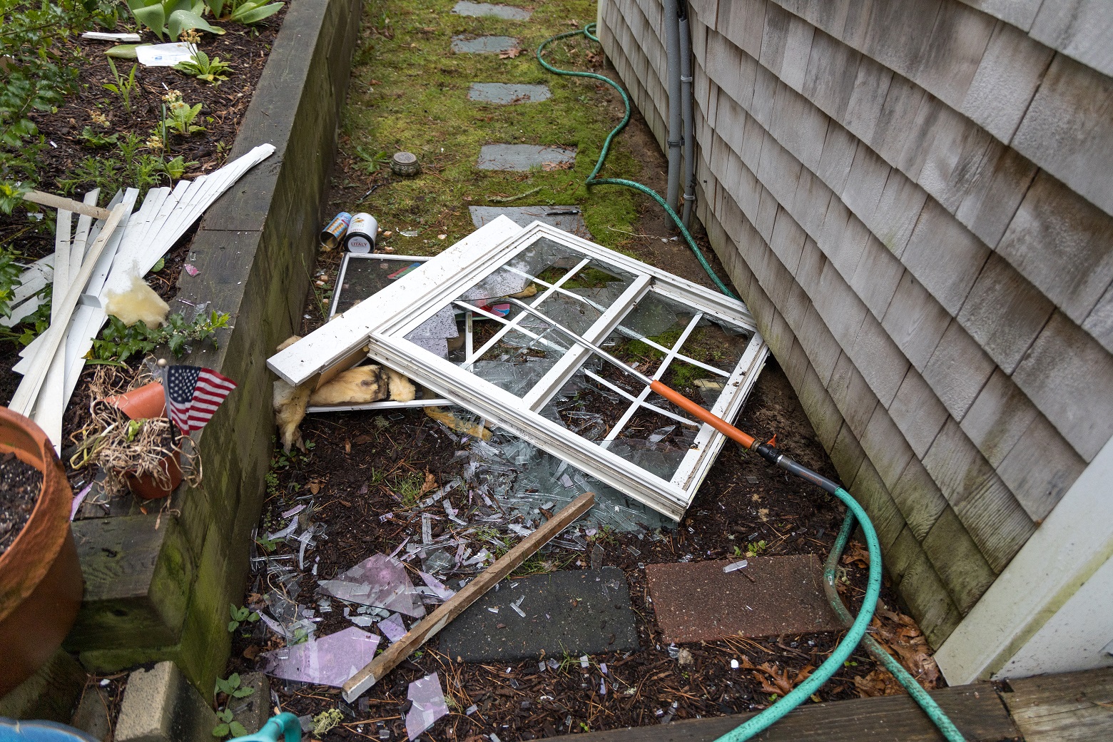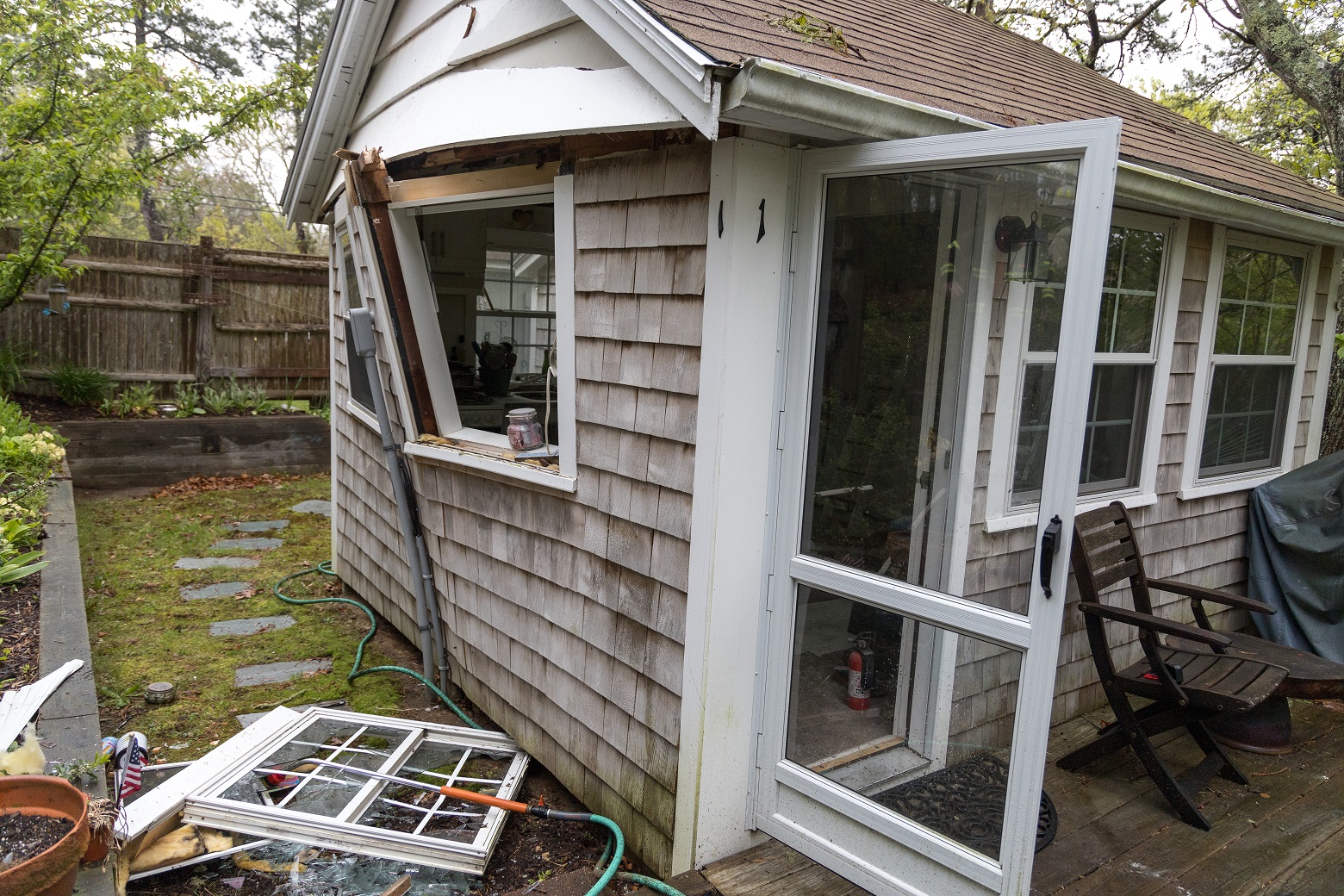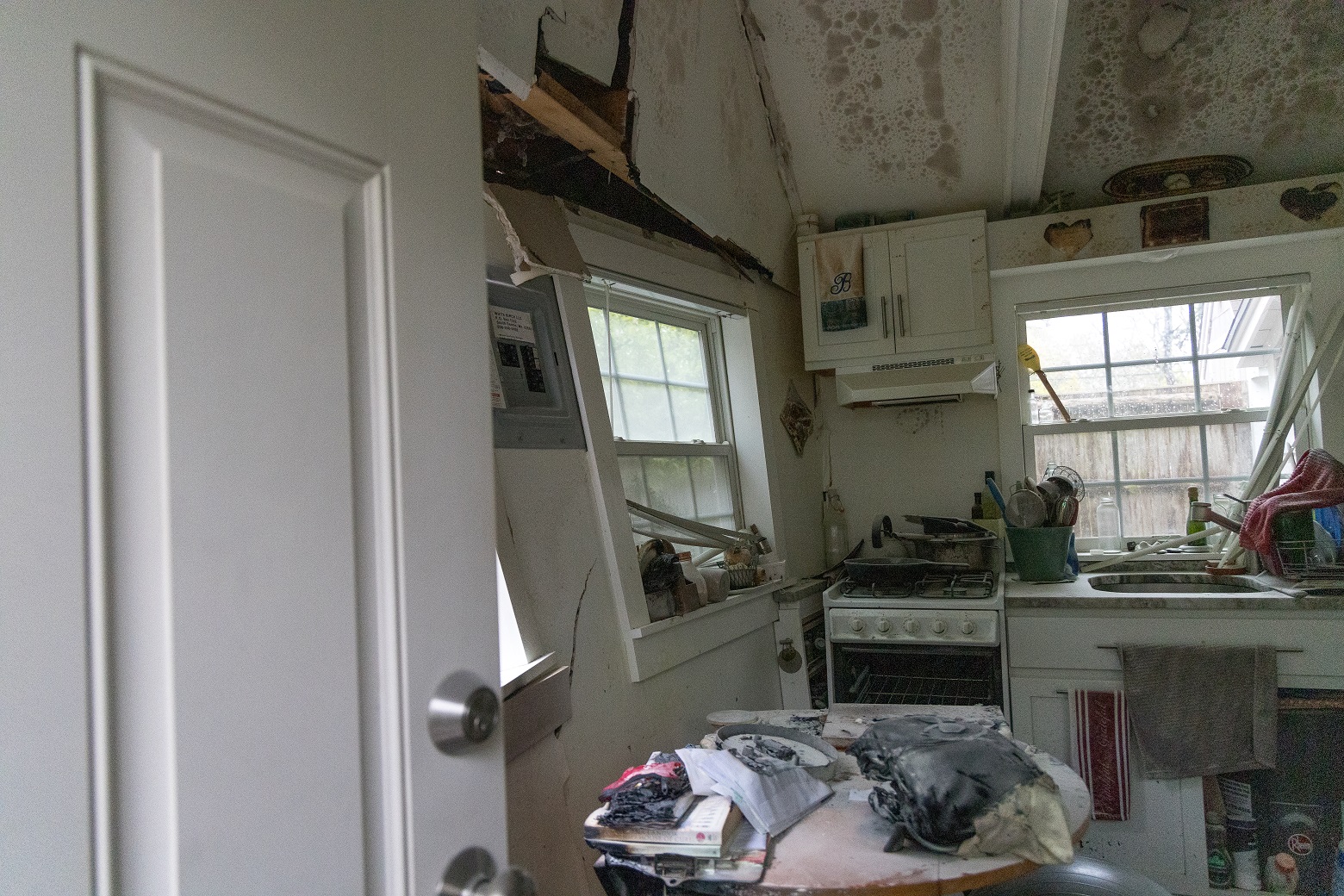 The explosion blew out the front wall of the cottage. There was shattered glass and burnt kitchen items.