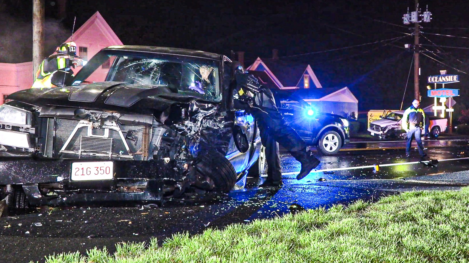 DENNIS PORT – [DEVELOPING] – At around 11:00 p.m. Sunday evening, police were just finishing up investigating a crash into an Arts & Crafts shop that closed down Main Street/Route 28 (click here for HN Video and coverage of the first crash scene) when they received word of a second serious crash several blocks away, in front of the Holiday Hill ice cream parlor. Upon arrival, first responders found two heavily damaged pickup trucks. All occupants from both vehicles were able to self-extricate. One of the occupants was evaluated for minor injuries. Route 28 needed to be completely shut down a second time as officials worked the scene.
