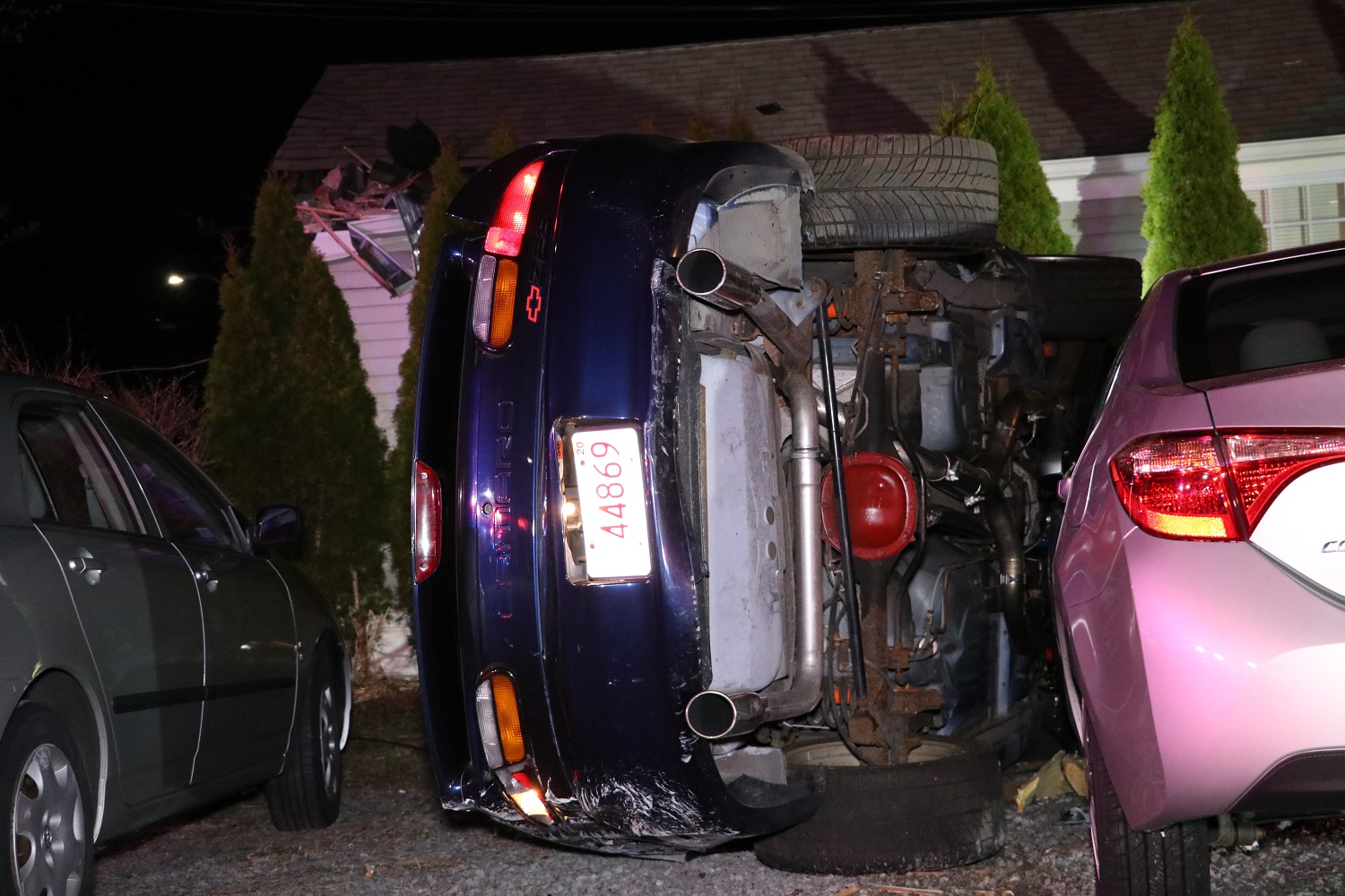 WEST DENNIS – A Chevy Camaro traveling along Route 28 somehow went airborne earlier this evening before bouncing off the roof of a house (leaving a gaping hole), and then landing perfectly on it’s side between two parked cars.