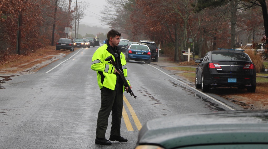 Above photo: Yarmouth Natural Resource Officers also responded to secure the perimeter… above, Natural Resource Officer Timothy Parsons is ready with some Mossberg 12 gauge firepower…