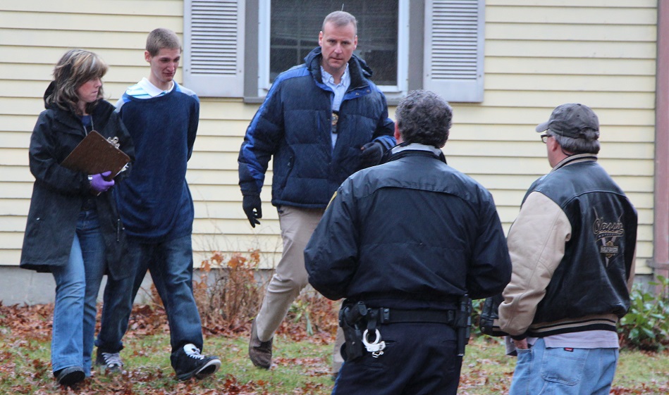 Above photo: A Barnstable Sergeant Detective briefly speaks with the owner of 364 Camp Street, the man who was recently renting a room to the suspect Kyle Rosenlund…