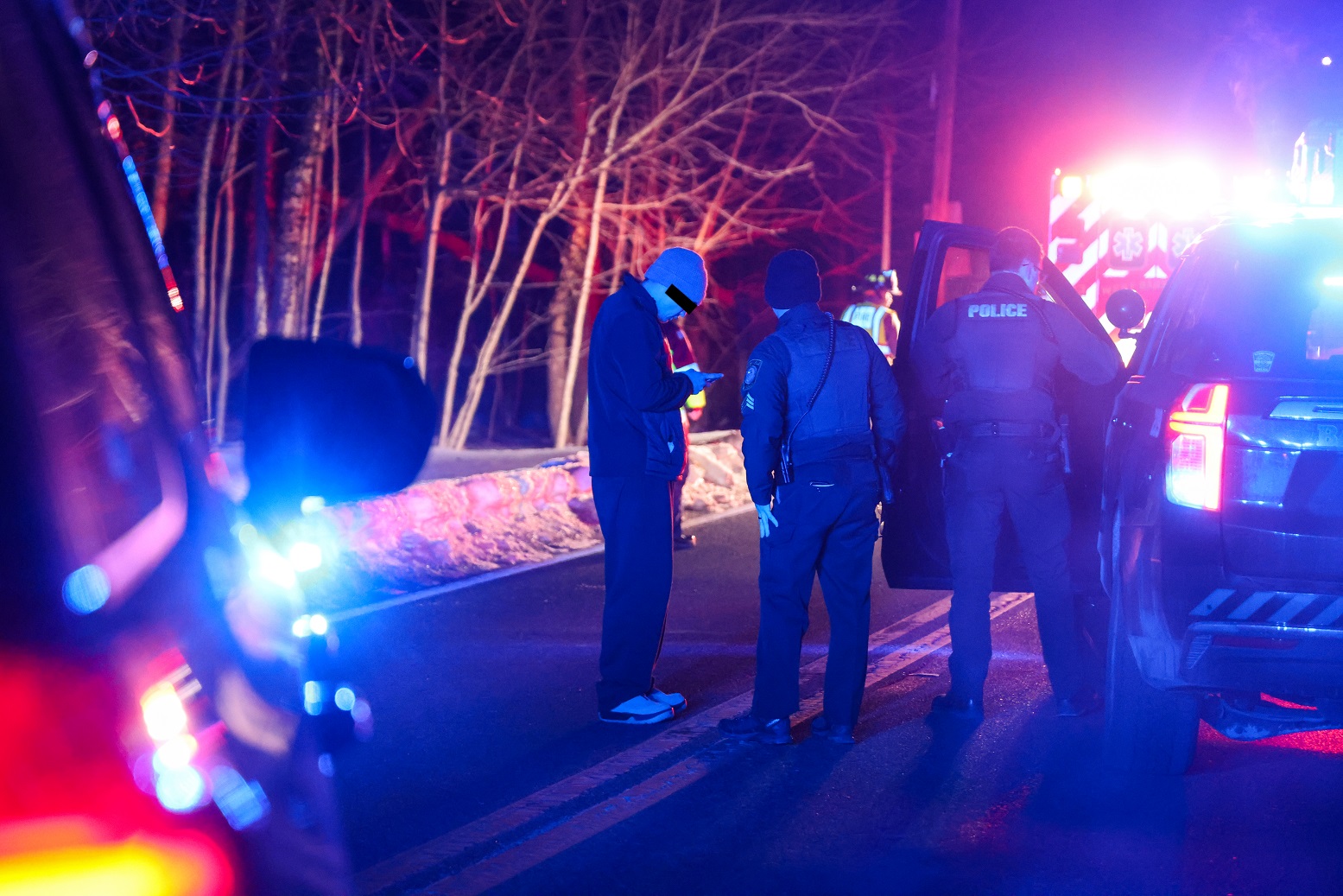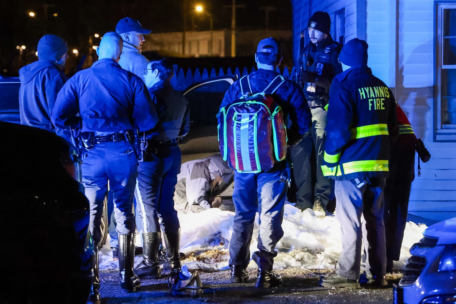 A woman was evaluated by rescue personnel during a traffic stop in Hyannis early Saturday morning. She ultimately did not require transport to a hospital and was eventually released from the scene to be driven home. It’s uncertain why she was on the ground in the photo above. The driver had been detained in handcuffs inside a cruiser when HN first arrived on scene. He was eventually released from custody. A female state trooper arrived on scene and spoke with the driver in what sounded like Portuguese. The driver was also eventually released from the scene.