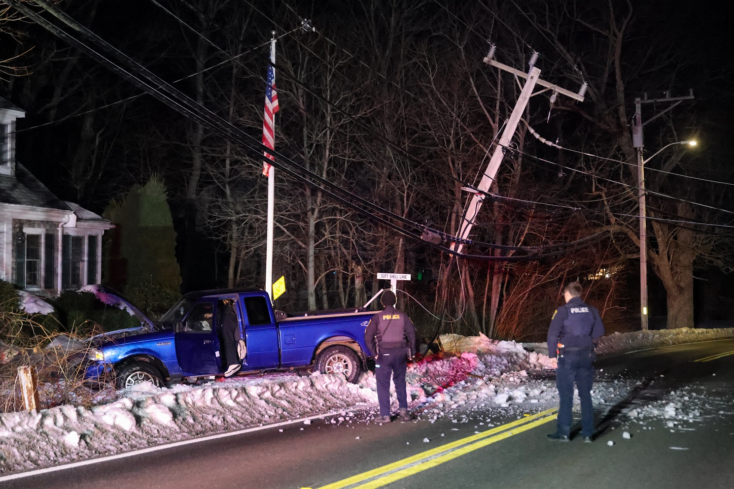 WEST BARNSTABLE, MASSACHUSETTS — An adult male driver escaped injury early Sunday morning after his pickup truck veered off Route 6A and crashed into a utility pole, snapping it in half and leaving the top section dangling from wires.