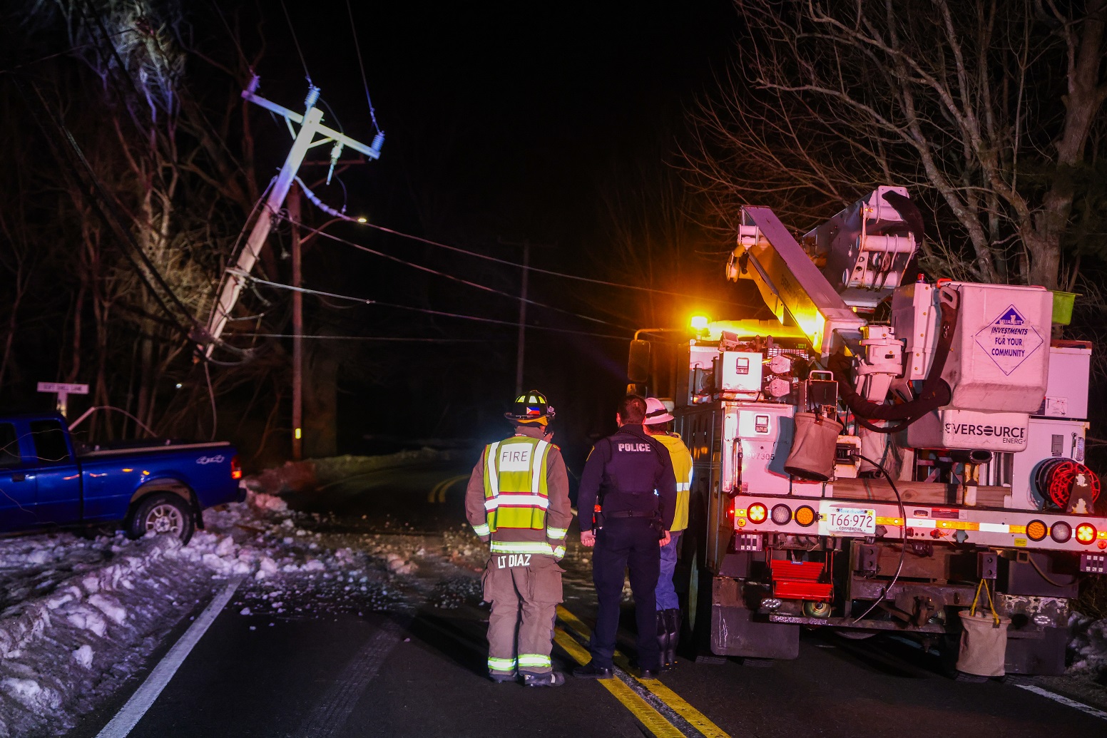 The impact severely damaged the utility pole, breaking off the bottom portion while the upper half hung suspended above the roadway by electrical wires. As a precaution, Route 6A was fully shut down between Route 149 and Willow Street to allow Eversource crews to safely replace the pole.