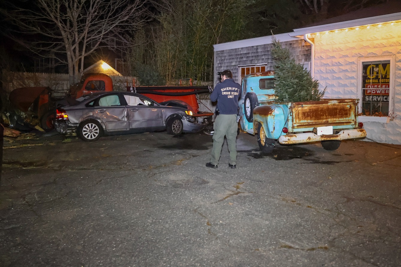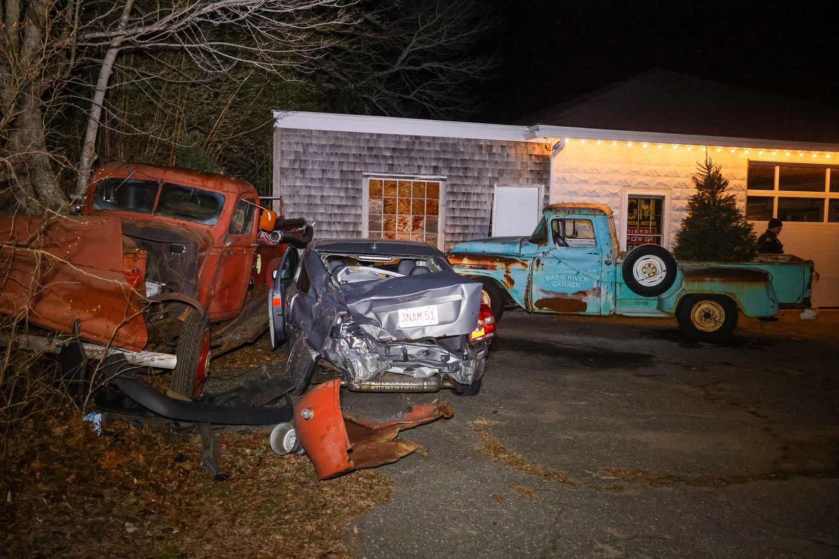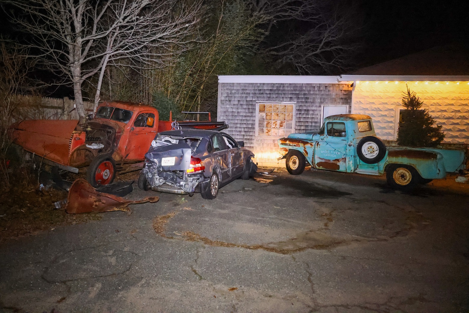 SOUTH YARMOUTH, Massachusetts – [DEVELOPING] – Yarmouth Police are investigating an early morning single vehicle crash on Old Main Street, where the adult male driver fled the scene on foot. A Volvo sedan apparently left the roadway, struck at least one utility pole, an antique Chevy pickup truck, and an antique fire truck. The crash sent the pickup truck barreling into the side of an old garage. The building inspector had to respond in order to check the structural integrity of the damaged building.