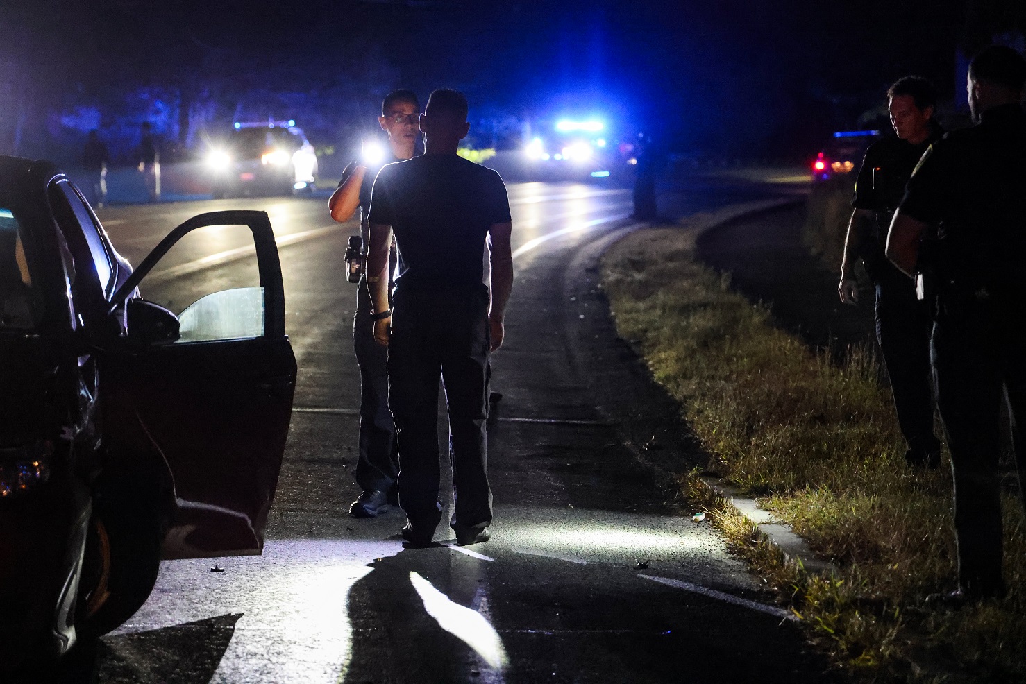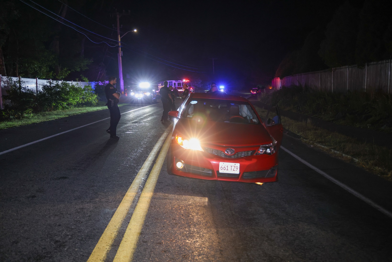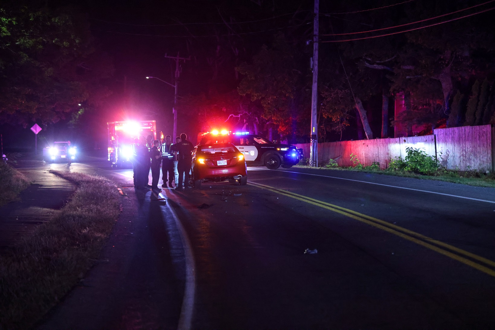 WEST YARMOUTH, MASSACHUSETTS – [HN photo notes] – A chaotic scene unfolded early this morning when a three-vehicle crash sprawled across Buck Island Road at Jannor Way, prompting a swift response from police and firefighters around 12:30 a.m. The wreckage stretched at least 50 yards, with one vehicle stranded in the middle of the roadway and another lodged among scrub pines, forcing authorities to shut down Buck Island entirely.