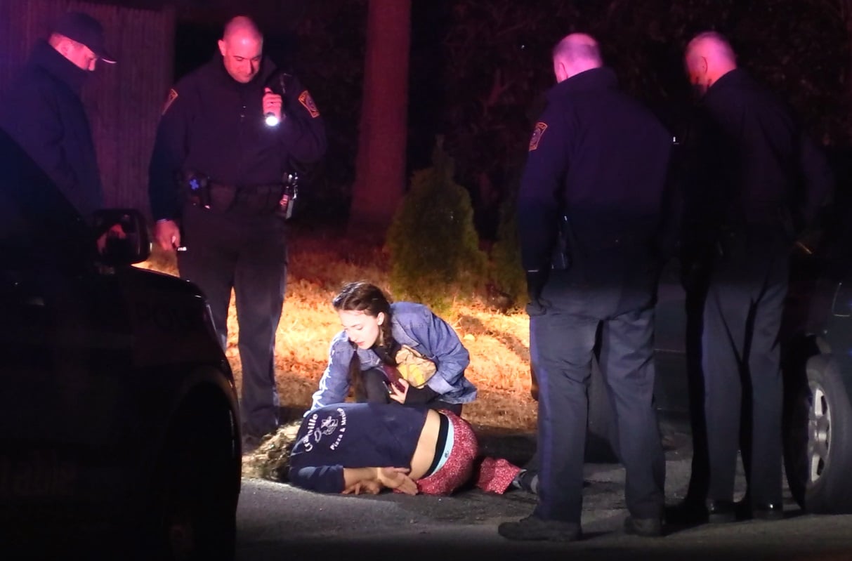 The female driver went back and forth between being upset, video recording officers and taking close-up shots of her male passenger who was in the middle of suffering from some type of overdose (possibly alcohol related) on the pavement.