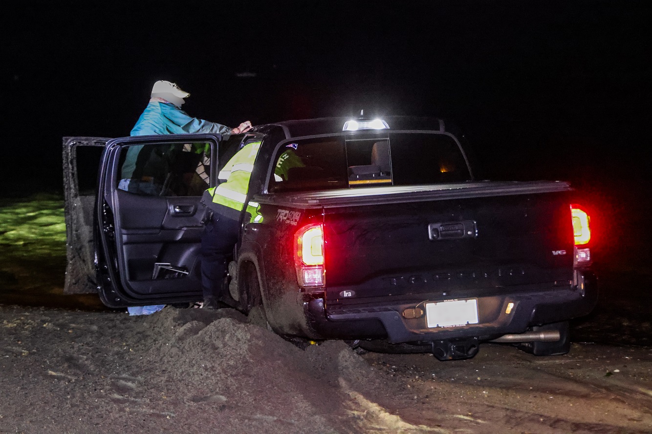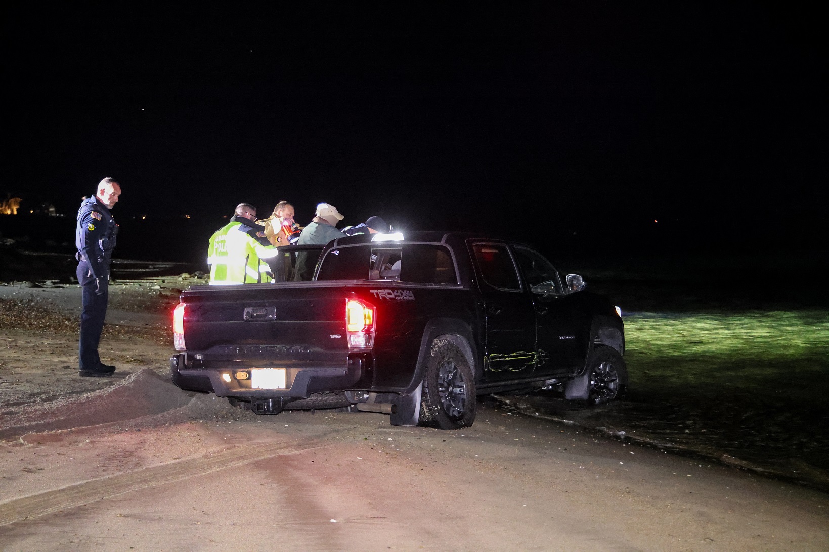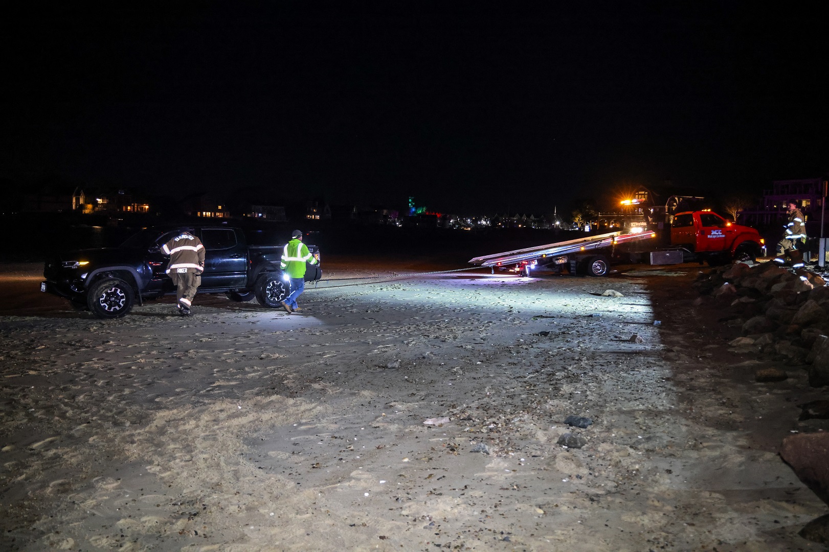 First responders’ top priority was the couple’s safety. The woman was seated on the passenger side and needed to be carefully maneuvered over the center console before firefighters could carry her across the sand to firmer, drier land. Once safely off the beach, the pair were ushered into a police cruiser to warm up. Thankfully, neither suffered any injuries.