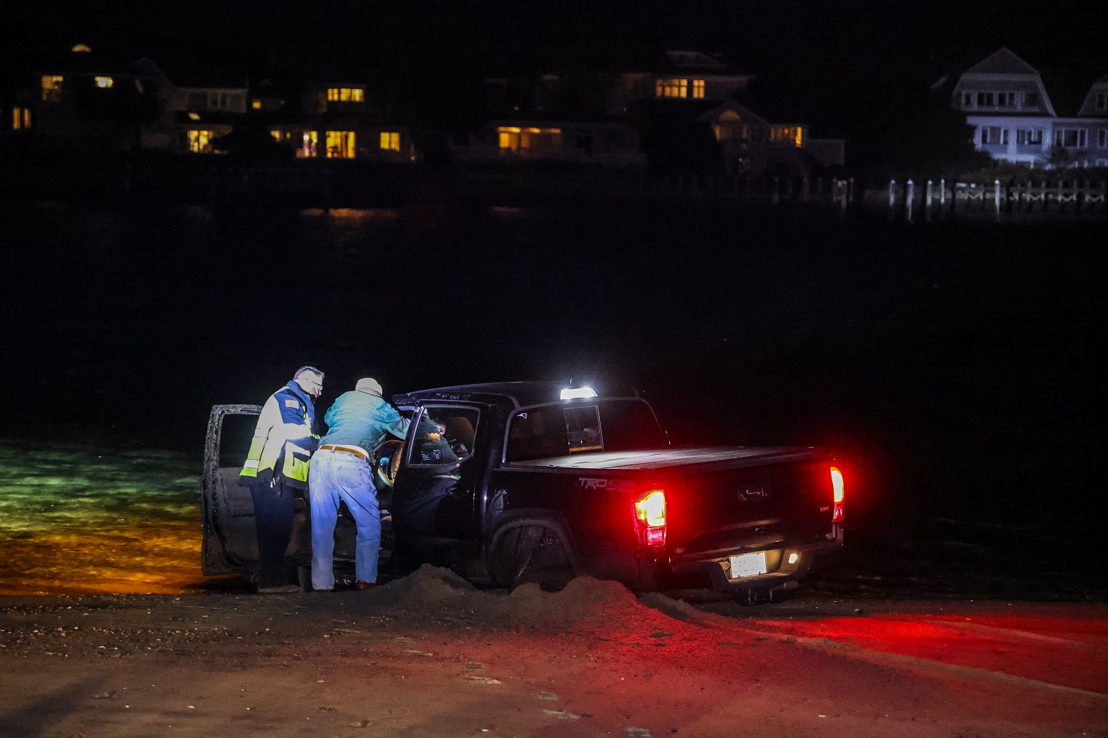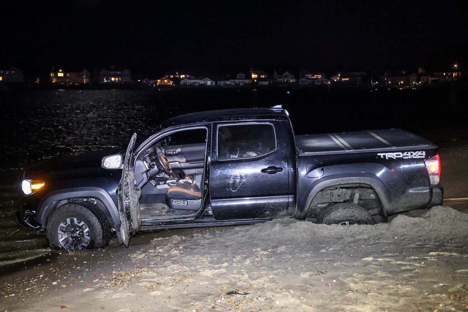 Yarmouth Police were fortunately paying attention to their Bayview Beach parking lot camera when they spotted a troubling sight: a Toyota Tacoma partially submerged at the harbor’s edge. Within minutes, a Yarmouth patrolman arrived on scene to discover the disoriented seniors in a precarious spot. The couple, unfamiliar with the area, had somehow navigated from the parking lot directly onto the beach – a path made all too easy by the absence of any gate or chain to block vehicle access. From there, it was just a matter of yards to the deep channel at the mouth of the Hyannis inner harbor. And it’s a good thing the pickup didn’t fully make its way into the channel.