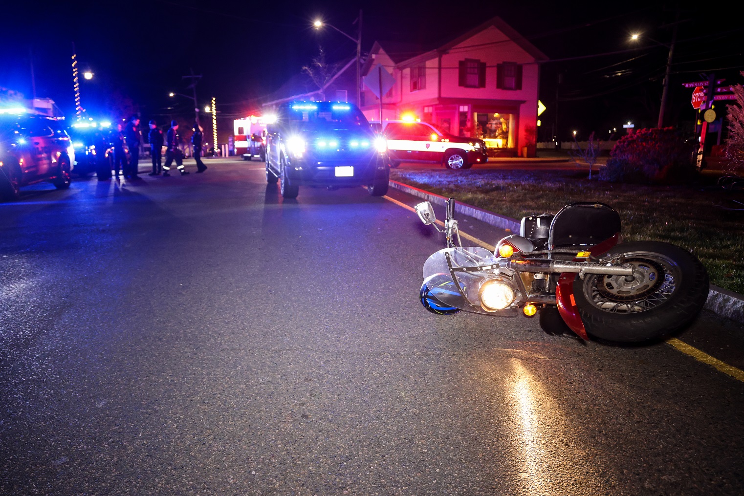 ABOVE: A 24-year-old motorcyclist was reportedly banged-up after losing control and crashing on Main Street in Hyannis early this morning. Shortly after 1:00 a.m., police and firefighters responded to the area near the intersection with South Street following reports of a single-vehicle motorcycle crash. Responders found the driver alert and conscious, and he was transported to Cape Cod Hospital for evaluation of injuries not believed to be life-threatening. The man’s motorcycle was towed from the scene. The Barnstable Police are investigating the cause of the crash.