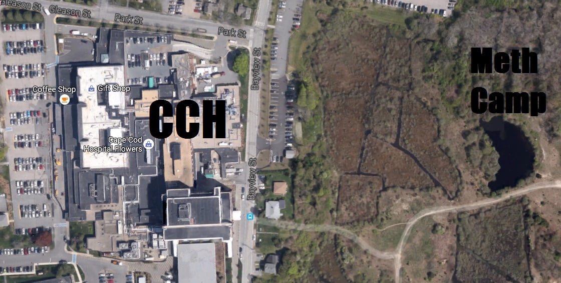 Yesterday afternoon, police officials were checking a homeless camp in a wooded area on Cape Cod Hospital property when they came across an active meth operation set up within a makeshift outdoor tent compound.