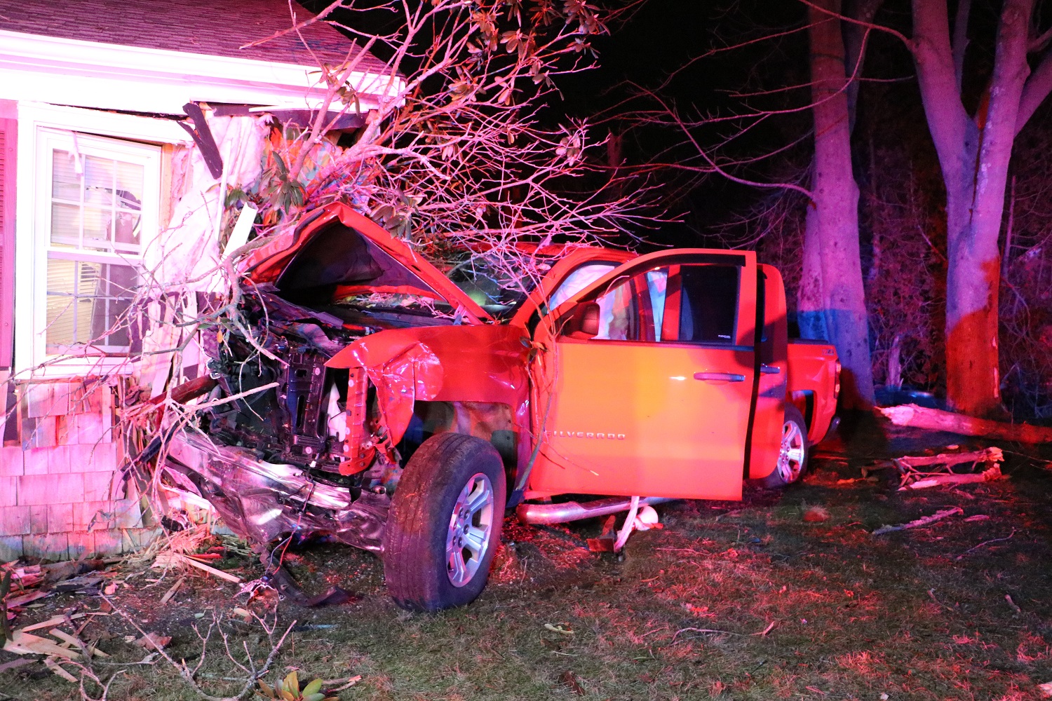 At about 1:50 a.m., Falmouth Police and Firefighters responded to 275 Jones Road after a full-sized Chevy pickup truck crashed into a home.