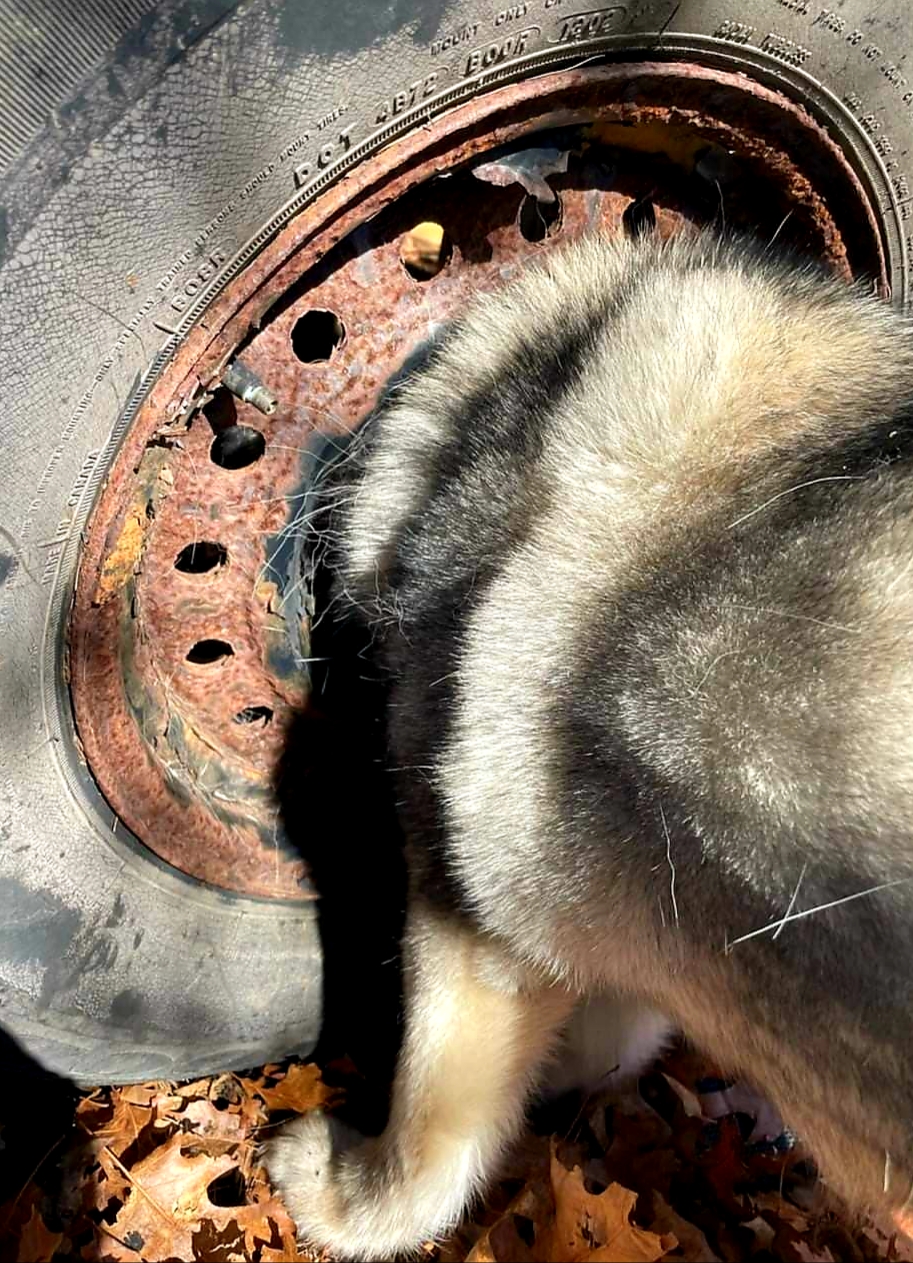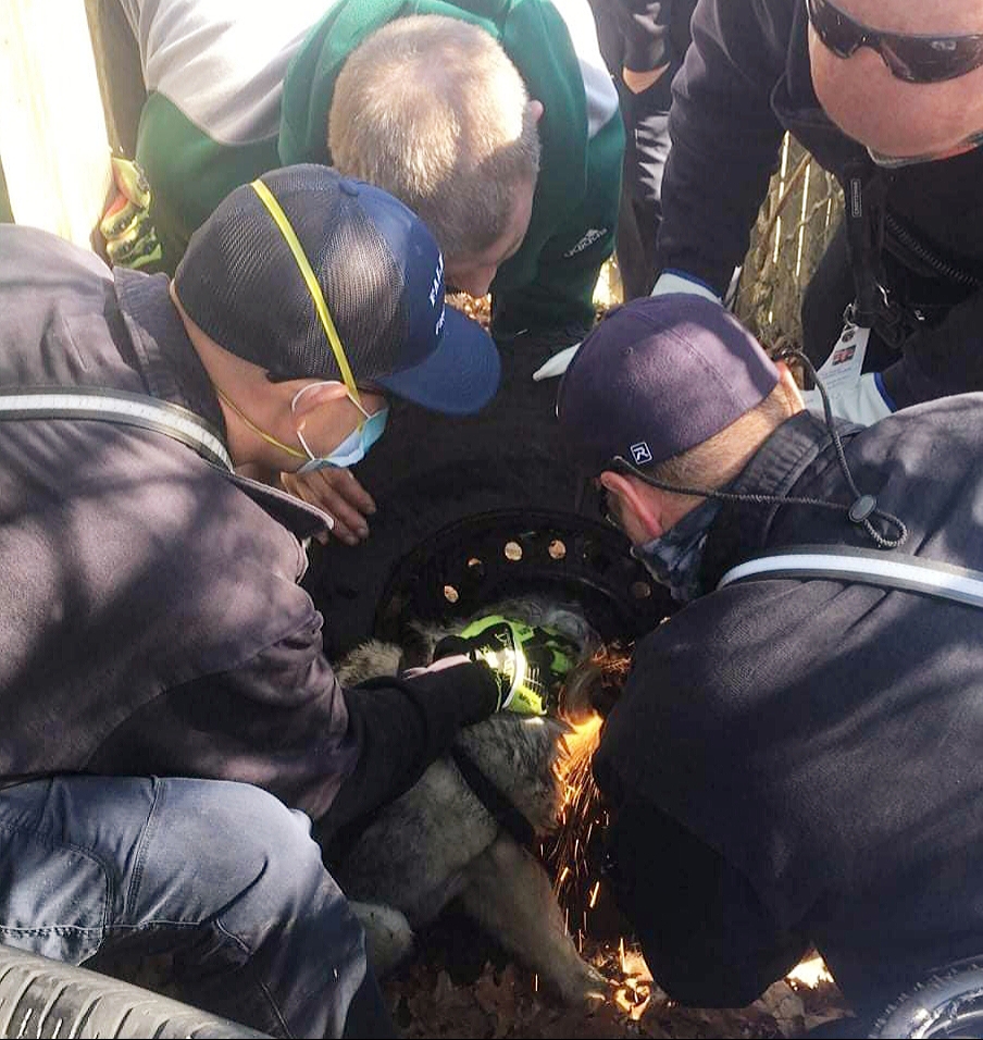 “This afternoon Falmouth Animal Control responded to a call for a dog who’s head had gotten stuck in an old tire. Once on scene, initial attempts to free Bella from the tire were unsuccessful. Falmouth Fire/Rescue were called in for assistance and after evaluation it was determined that the tire would need to be cut in order to free Bella. While using great care and precision the team was able to saw through the rim of the tire to free Bella. Thank you to the Falmouth Fire/Rescue Team for their hard work and determination!”