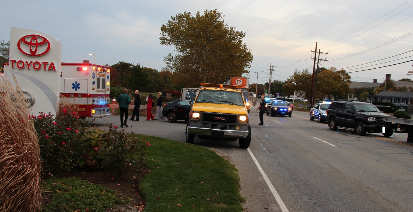 At about 5pm, Barnstable Police and Hyannis Rescue rushed to what was originally reported as a two car “MVA with PI” (personal injury) on Route 132 right in front of the Toyota dealership. In fact, the crash happened right at the dealership’s exit, with one vehicle still in the driveway, to be more exact.
