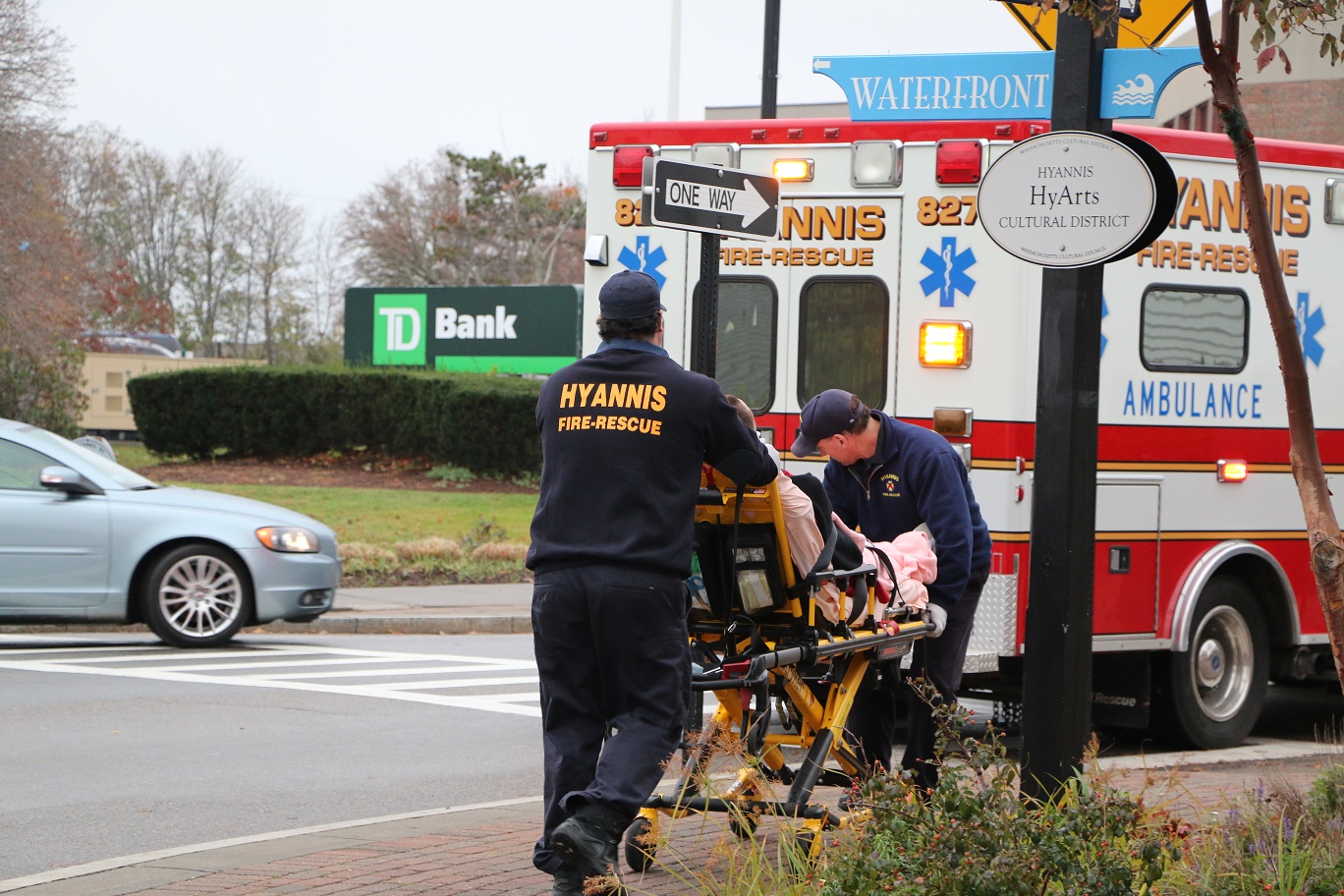 PHOTO: Hyannis firefighters help a man who said he was struck by a vehicle in the area of Center Street and Main Street on Thursday afternoon. The patient was transported to CCH with injuries that were not life-threatening…