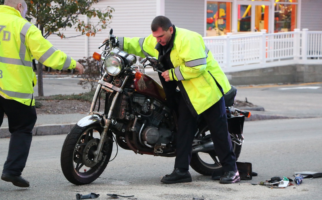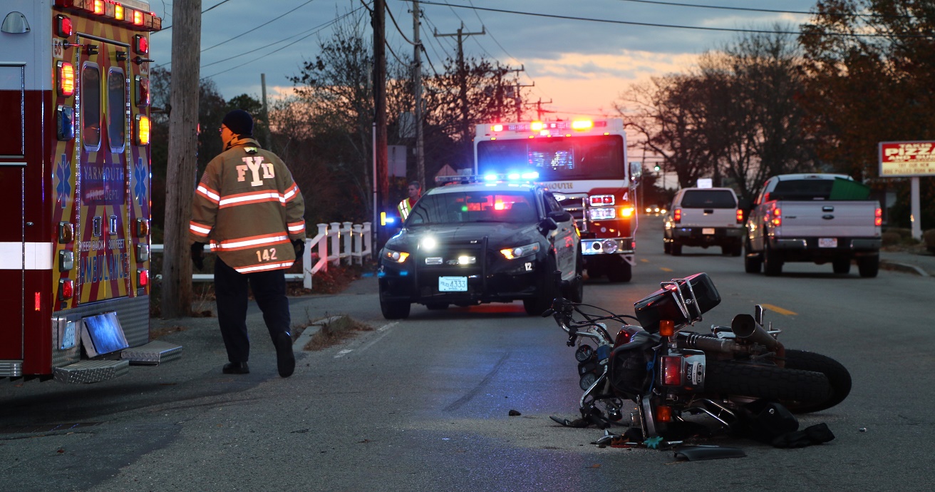 PHOTOS: YARMOUTH — A motorcyclist was hurt and taken to CCH after a collision with another vehicle on Route 28 near Takis Pizza on Friday afternoon. The biker was down in the street but able to talk with first responders. One witness told HN he was very worried about his beloved bike and wanted to make sure all of the parts went along with the motorcycle on the tow truck when it got hauled away…