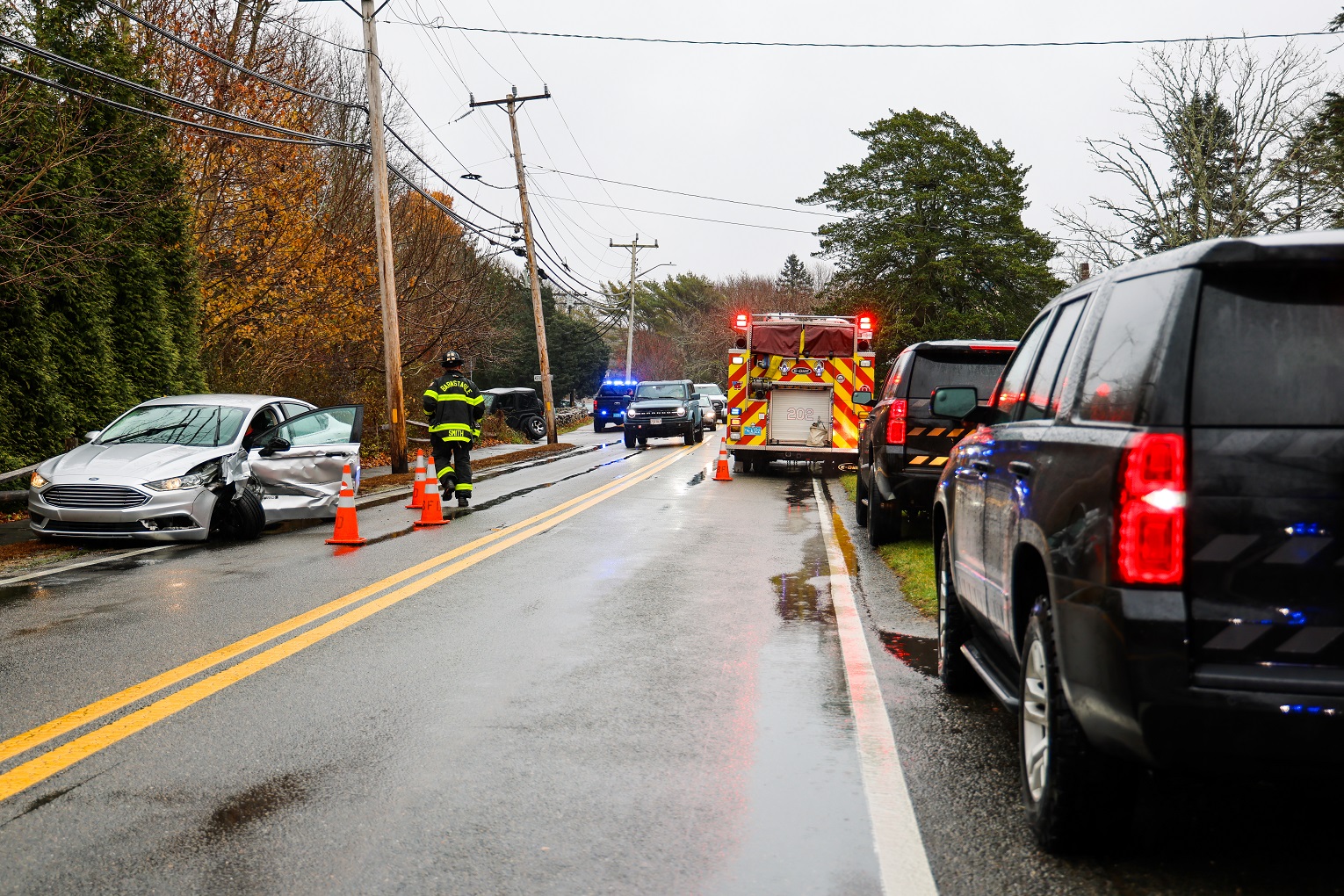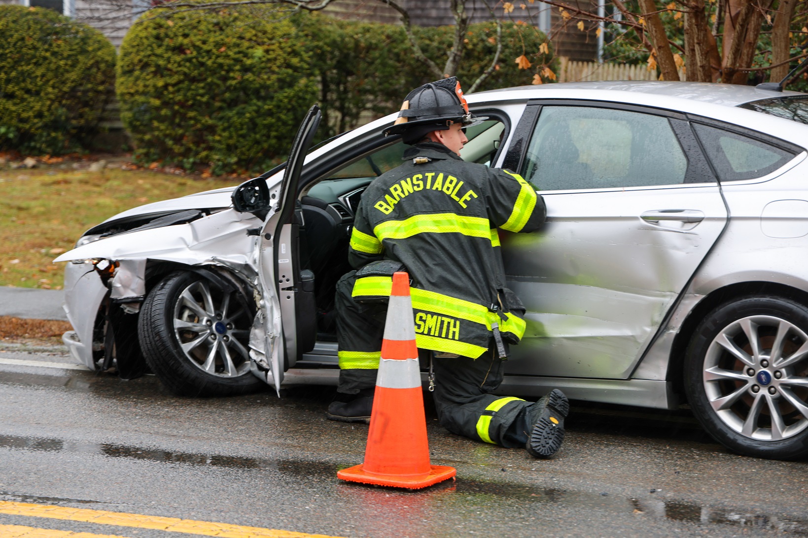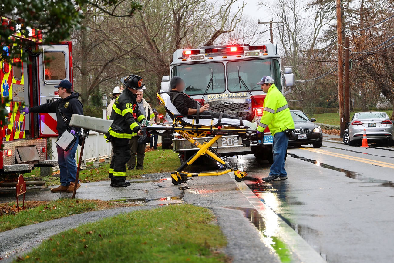 BARNSTABLE – [HN NOTES & MULLINGS ON THE MATTER] – As can be seen in the above HN photos, the Barnstable Police are investigating what caused at least one vehicle to cross over the center line and collide with an oncoming car yesterday afternoon. Fortunately, nobody was seriously injured (one driver was evaluated inside an ambulance but refused transport) and the damage appeared to reflect both vehicles being “clipped” on the driver’s side, near the front tire area. The crash happened early afternoon, on Route 6A near the intersection with Keveney Lane. The roads were wet from a steady, ongoing light rain. Heavy Sunday traffic became backed up in both directions as officers needed to stop cars, reducing the flow to one lane, intermittently in each direction. It was an all-too-common midday mess.