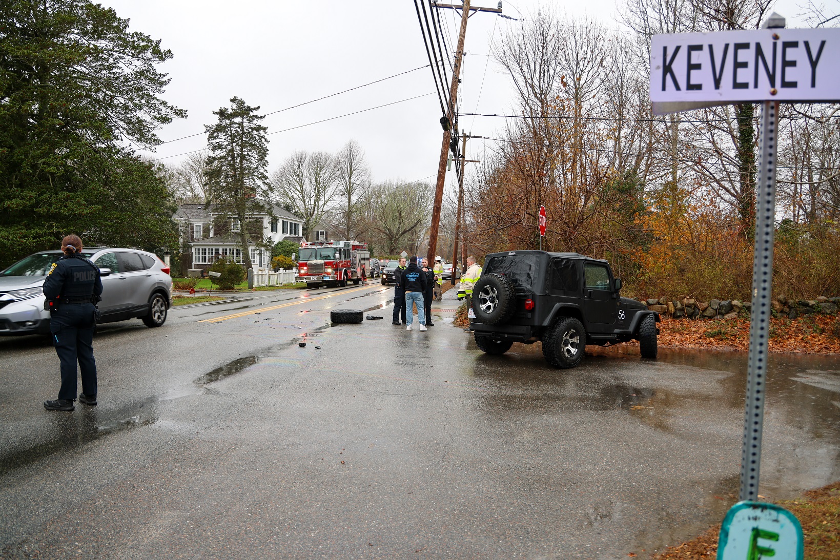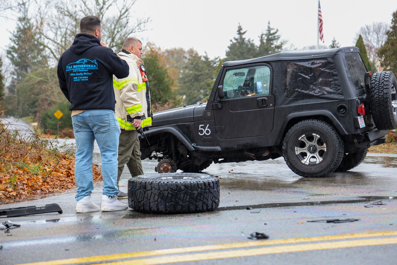 Top HN photo: A driver stoops over to pick up his Jeep’s front tire at a Route 6A crash scene, Sunday afternoon…