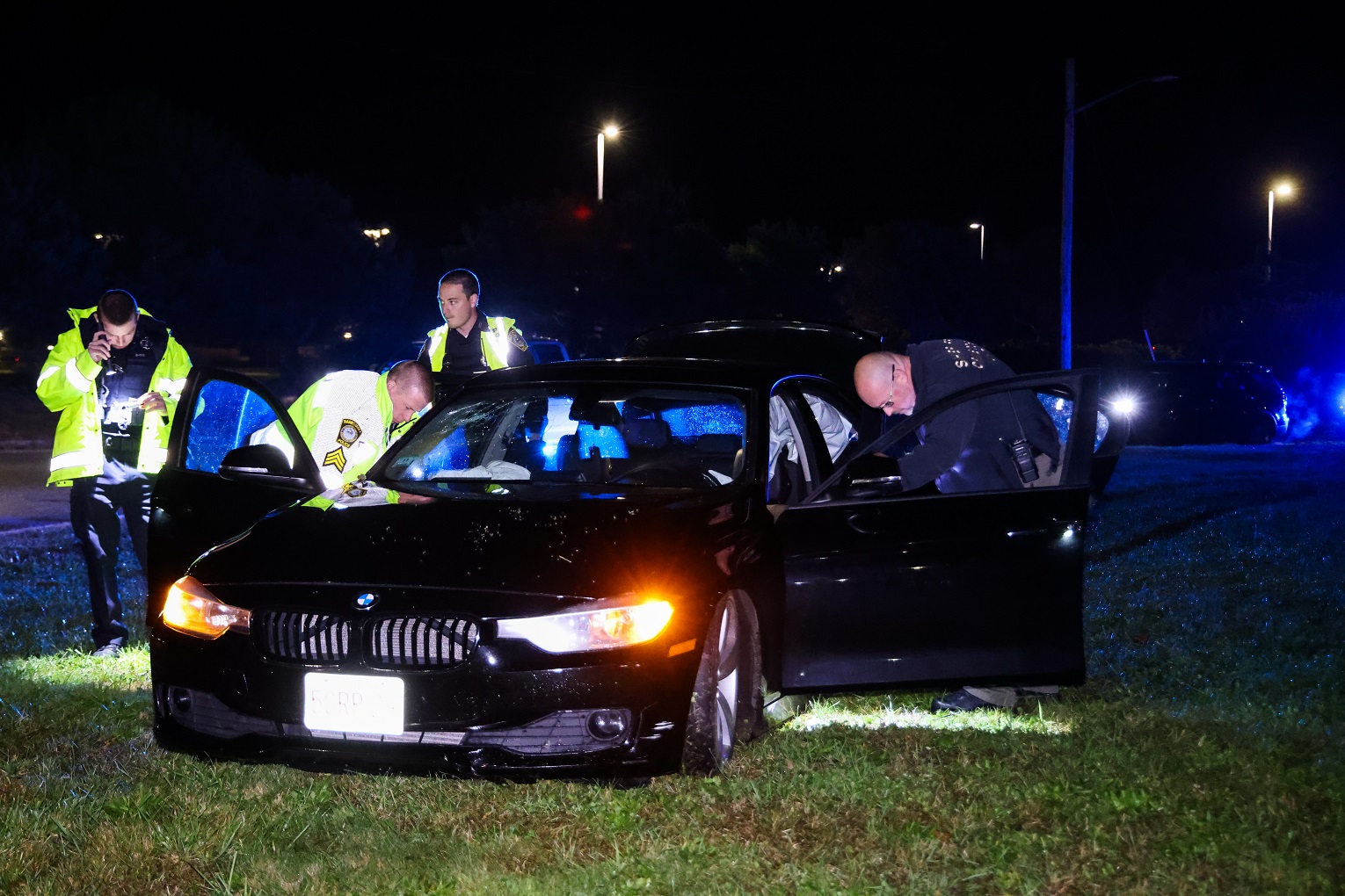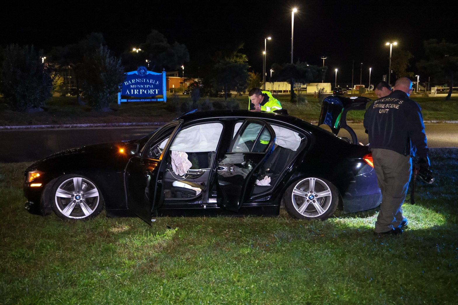 The second BMW to crash this morning apparently left the roadway and became disabled in the middle of the Airport Rotary in Hyannis. The driver had fled prior to police arriving on scene. Moments after Barnstable Police discovered the disabled BMW, the registered owner allegedly called dispatch reporting his car stolen. The registered owner lives in the town of Yarmouth, but a “ping” allegedly placed his phone in the area of the crash. (Strange…) When police called back the phone used to report the stolen vehicle, nobody answered. Yarmouth Police went to the address of the registered owner in their town, but at the time of this report, it’s uncertain whether they were able to locate him. The BMW was damaged and needed to be towed from the scene. The vehicle appeared customized to sit low to the ground. It is believed the modified BMW crashed onto the soft grass and dug in, causing damage with airbag deployment. The Barnstable Police Department is investigating the cause of the crash, along with the report of it allegedly being stolen.