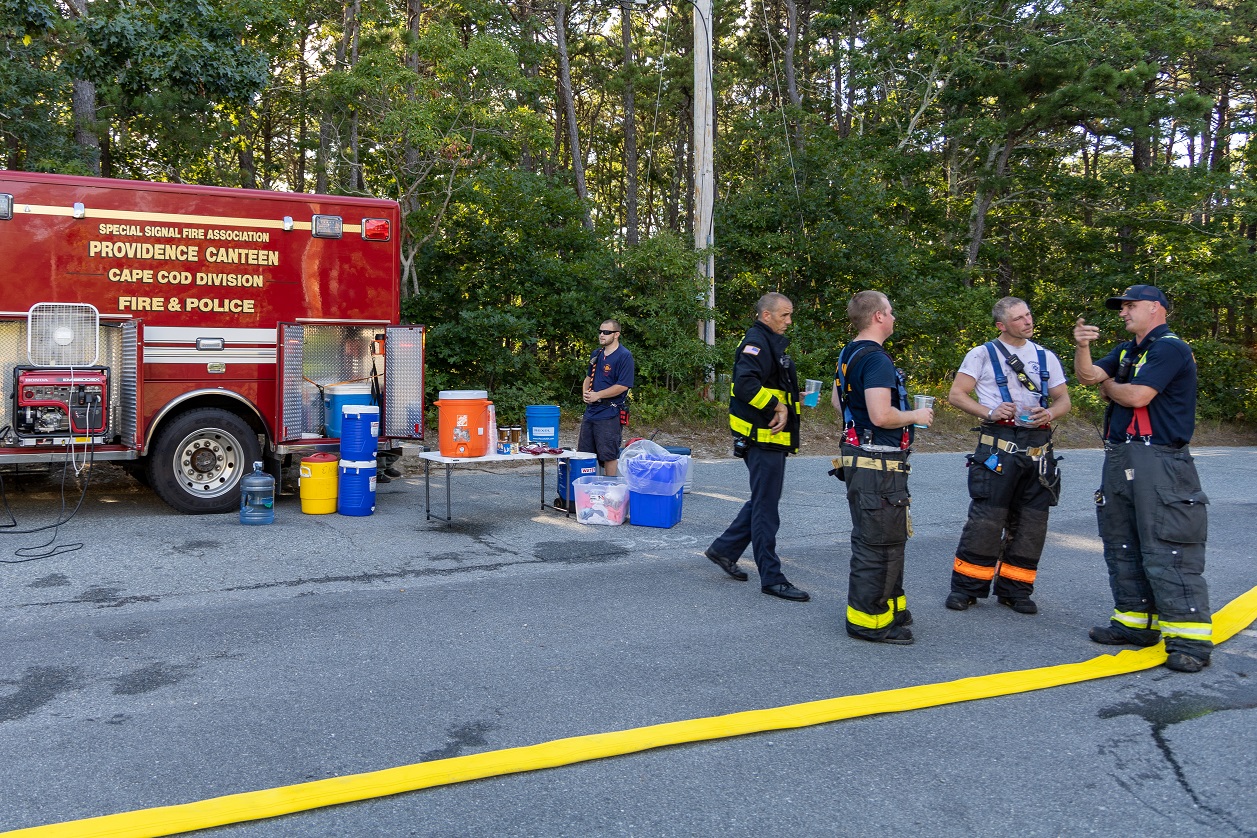 Volunteers with the Cape Cod Division of the Providence Canteen responded to help firefighters re-hydrate and cool off.