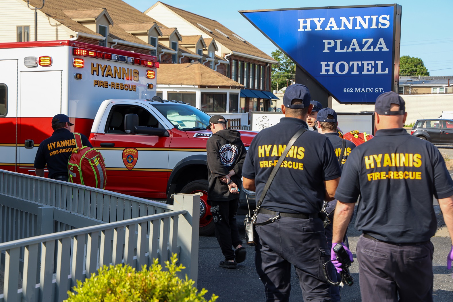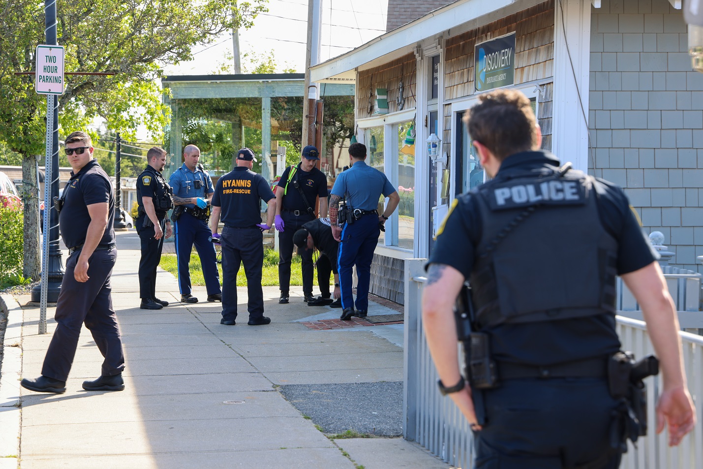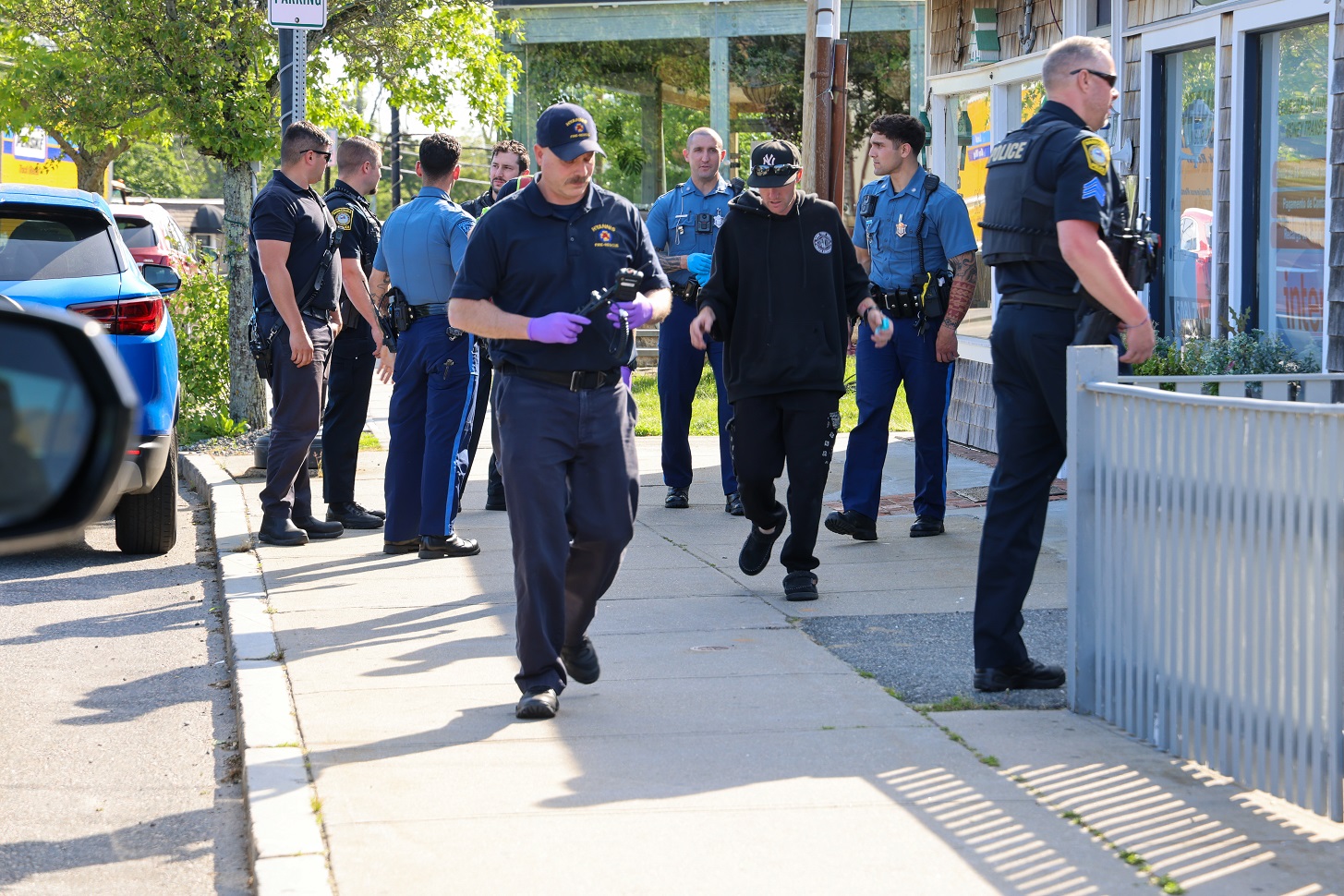 Above HN photos – HYANNIS, MASSACHUSETTS: For the past two evenings, about half a dozen members of the Massachusetts State Police Community Action Team (CAT) supplemented the normal number of state troopers and Barnstable Police officers patrolling the Hyannis area, especially in the downtown Main Street area. The CAT unit does not take mandatory calls for service and are free to focus on anti-crime and traffic enforcement initiatives. CAT members and Barnstable Police patrol officers assigned to Hyannis initiated dozens of traffic stops last evening in the Main Street area alone. In the above photos, state troopers assigned to the CAT unit were patrolling Main Street in the West End of Hyannis on Tuesday afternoon when they pulled over and addressed some type of disturbance possibly involving a simple assault. A young man involved in the disturbance was checked out by Hyannis FD Rescue.