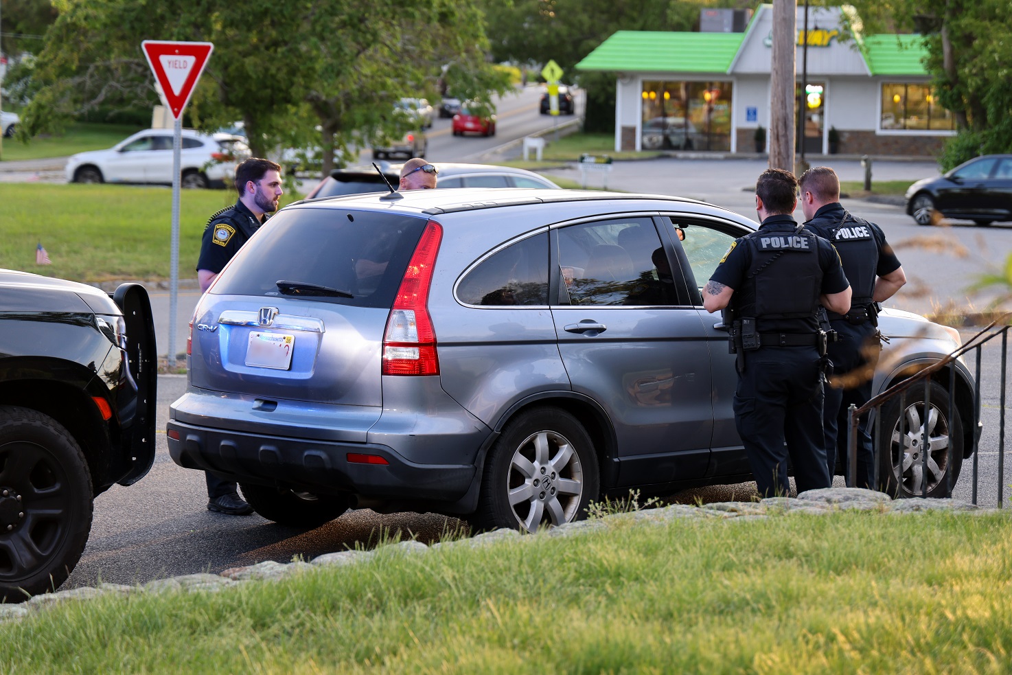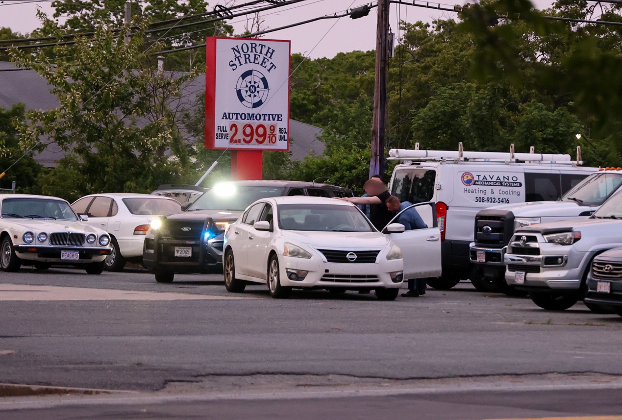 Above HN photo: Members of the Barnstable Police patrol force assigned to the Hyannis area speak to the occupants of a suspicious vehicle during a traffic stop at the West End rotary Tuesday afternoon. The occupants of the vehicle were wearing ski masks. Police had received a call regarding the suspicious vehicle and its occupants about a half hour earlier. Officers spoke to the occupants about the ski masks drawing attention. The situation was well documented, and the occupants were advised about their behavior likely drawing attention and causing alarm…