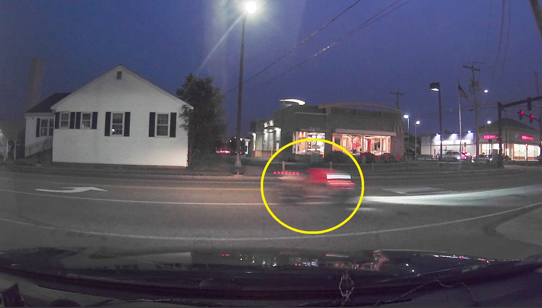 Above HN dashcam screengrab: A reckless motorcyclist takes off from a state trooper from the parking lot of 500 Main Street last evening. The reckless motorcyclist was traveling so fast on High School Road that all HN dashcam frames were blurred. The area was heavily congested with pedestrians and vehicles at the time… and troopers immediately called off all attempts to stop the fleeing motorcycle for public safety reasons. Barnstable Police patrol officers were alerted… along with Yarmouth Police patrol officers, as the idiotic and reckless motorcyclist was last observed speeding east on Route 28 across the town line into Yarmouth. A short while later, Barnstable Police had a second idiotic and reckless motorcyclist take off from them in Hyannis. The very brief “pursuit” was immediately called off due to public safety concerns.
