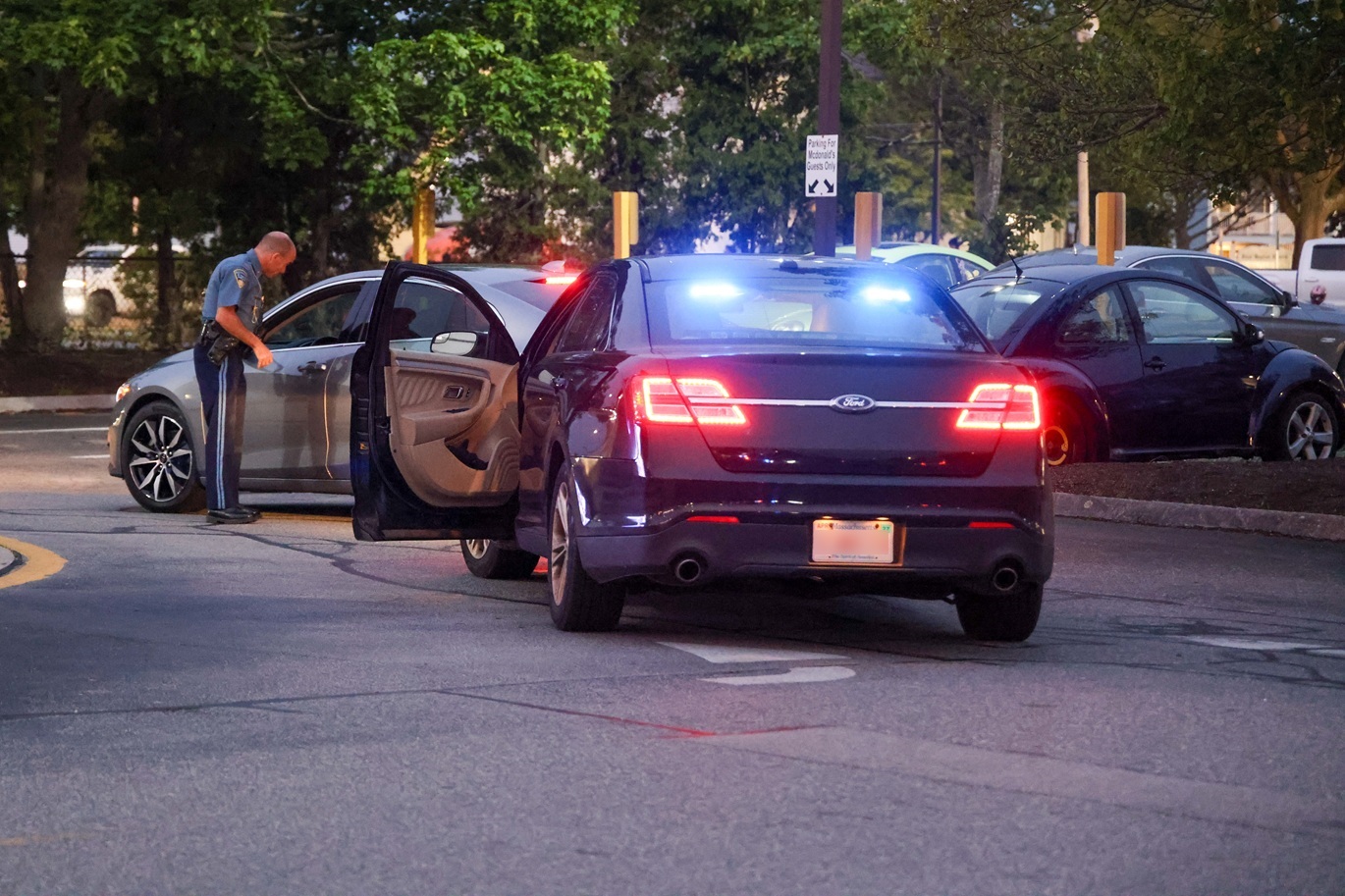 Above HN photo: A trooper assigned to the Massachusetts State Police CAT unit conducts a traffic stop in the McDonald’s parking lot on North Street last evening.