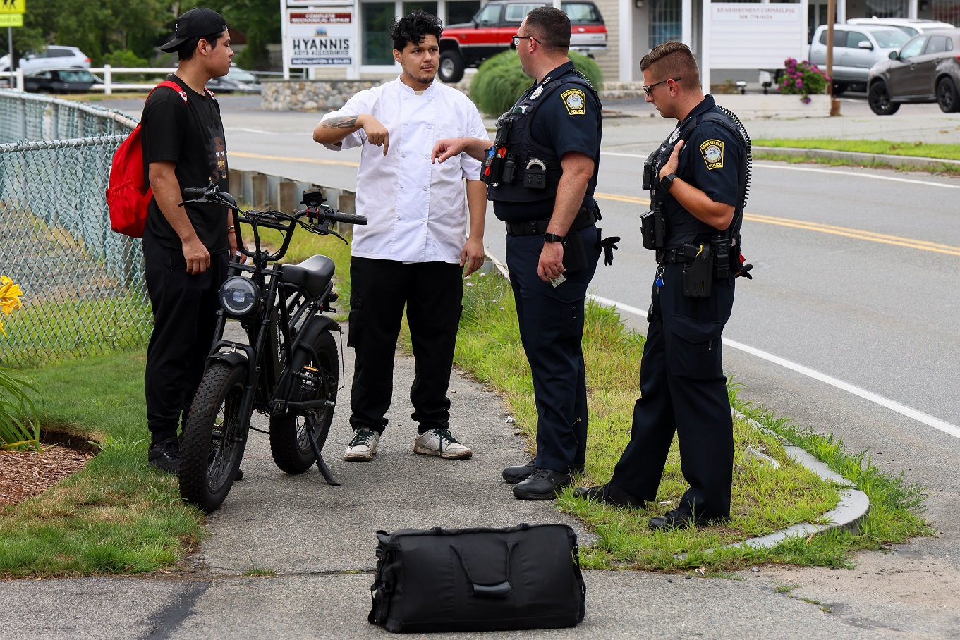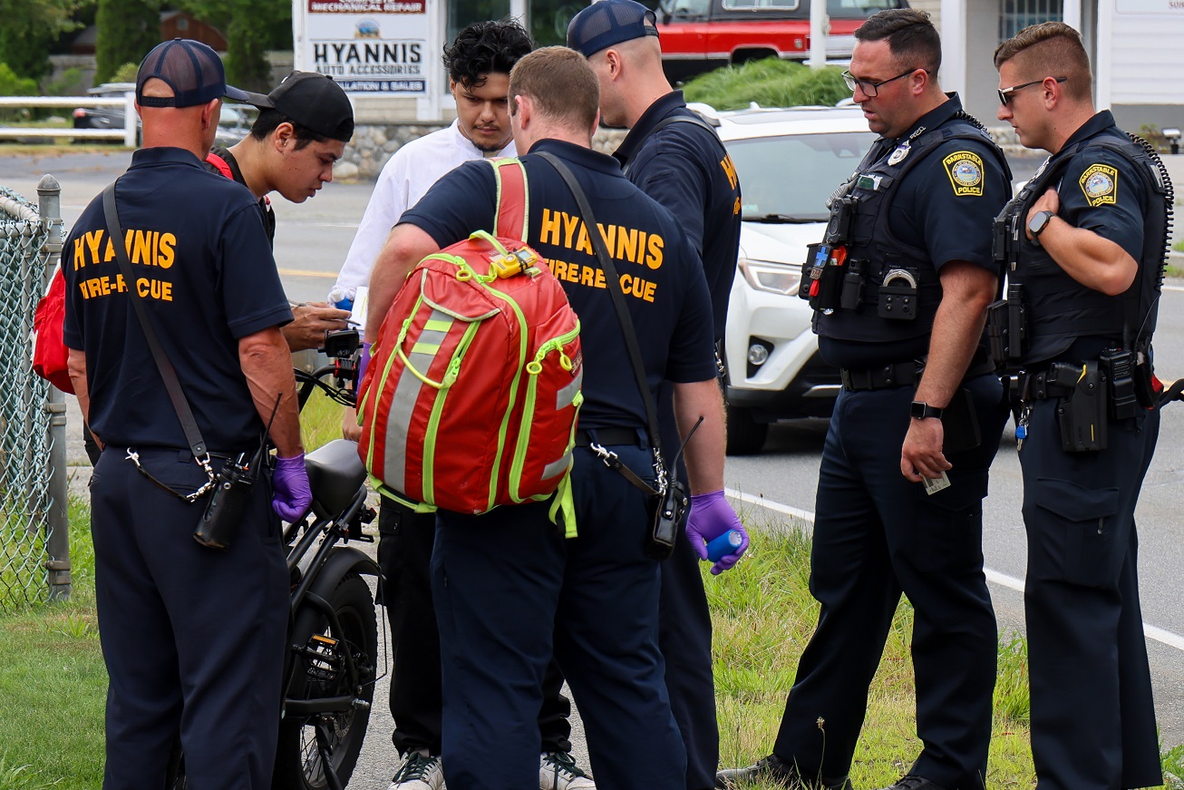 ABOVE HN PHOTOS: Barnstable Police and a Hyannis FD ambulance crew responded to West Main Street after a report of a crash involving an eBike vs. motor vehicle this afternoon. The rider of the eBike was evaluated on scene for minor injuries and was not transported to hospital.