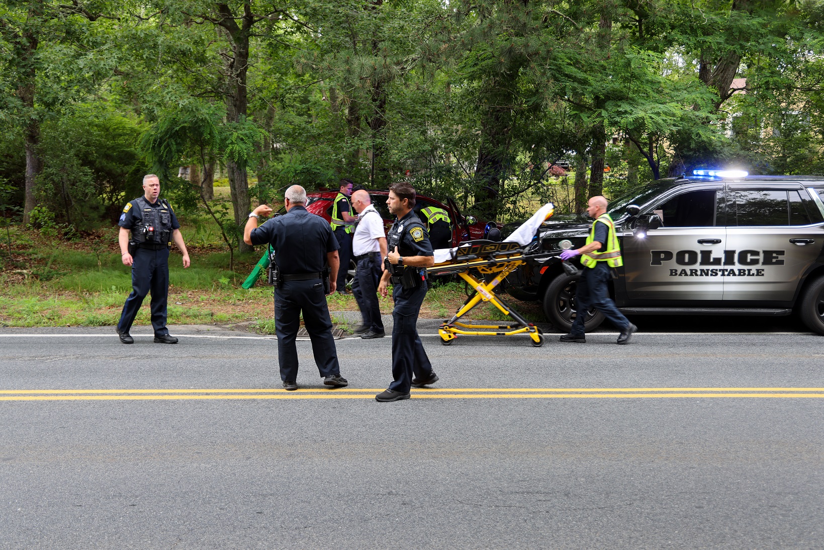 ABOVE HN PHOTOS: Police and firefighters responded to a report of a single vehicle crash into a tree on Oak Street in Centerville this afternoon. The woman had reportedly suffered some type of sudden medical emergency prior to the crash. She was conscious when HN arrived on scene… and eventually transported to Cape Cod Hospital for evaluation and further care.