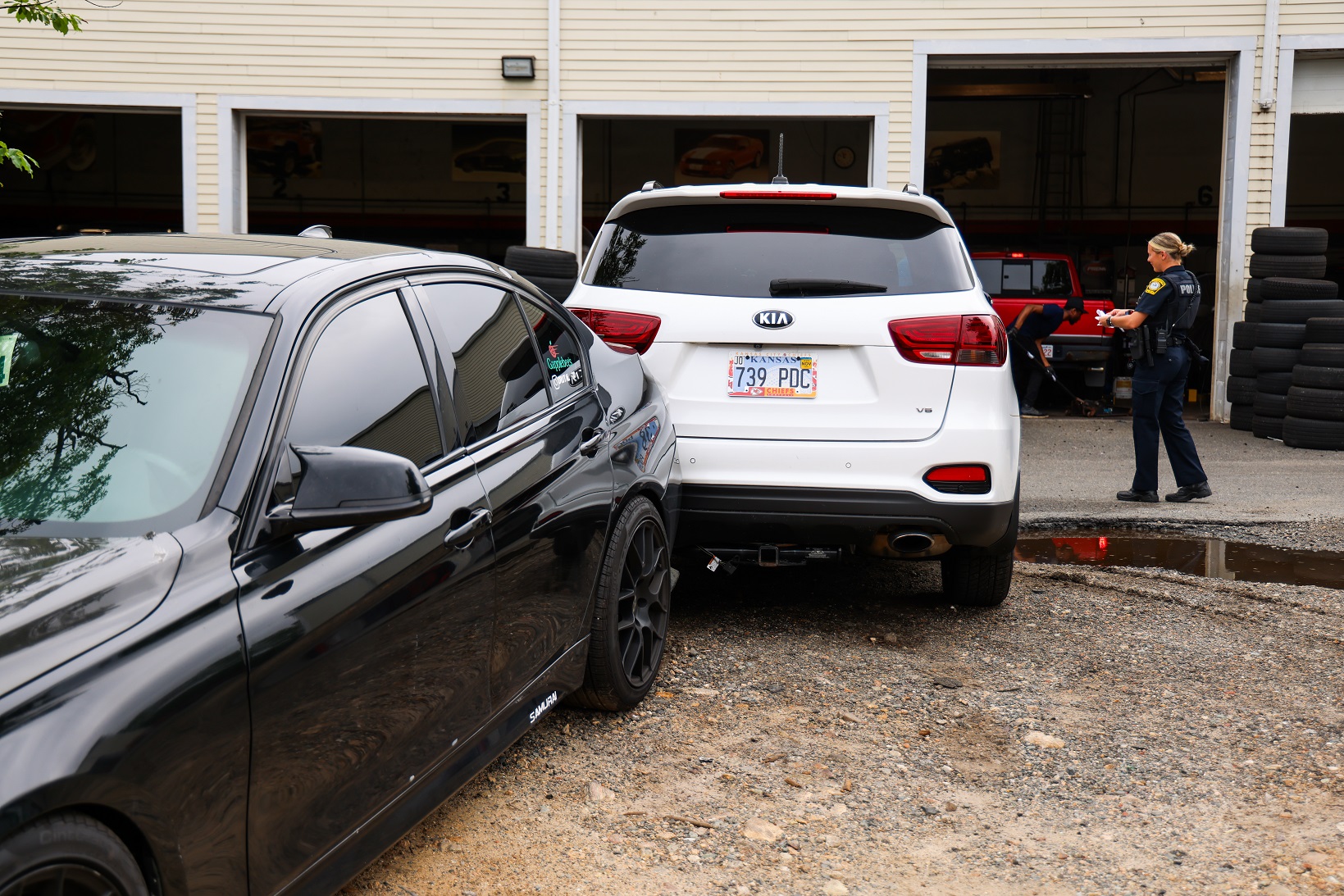ABOVE HN PHOTO: Police and firefighters responded to the rear parking lot of Town Fair Tire in Hyannis this afternoon for a report of a car vs. pedestrian. Once on scene, HN was informed the SUV had backed into a pedestrian, briefly pinning him against a parked vehicle. The pedestrian’s injuries were not believed to be life-threatening. The Barnstable Police investigated with assistance from a member of the sheriff’s crime scene unit.