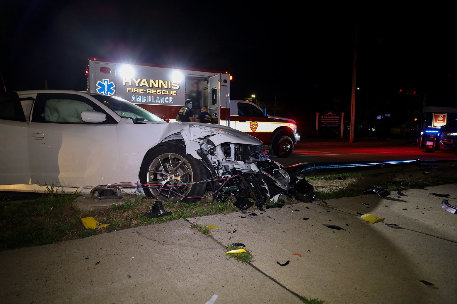 HYANNIS – A mom and her young child were checked out by Hyannis Rescue after taking out a light pole on High School Road shortly before midnight last evening. A trip to the hospital wasn’t necessary. The light pole, on the other hand, was toppled over and shattered into pieces. The driver (the mom) did not show any obvious signs of impairment. The Dodge Charger was a rental vehicle, according to radio transmissions. The driver and child were given a ride home by friends. The Barnstable Police Department is investigating the cause of the crash.