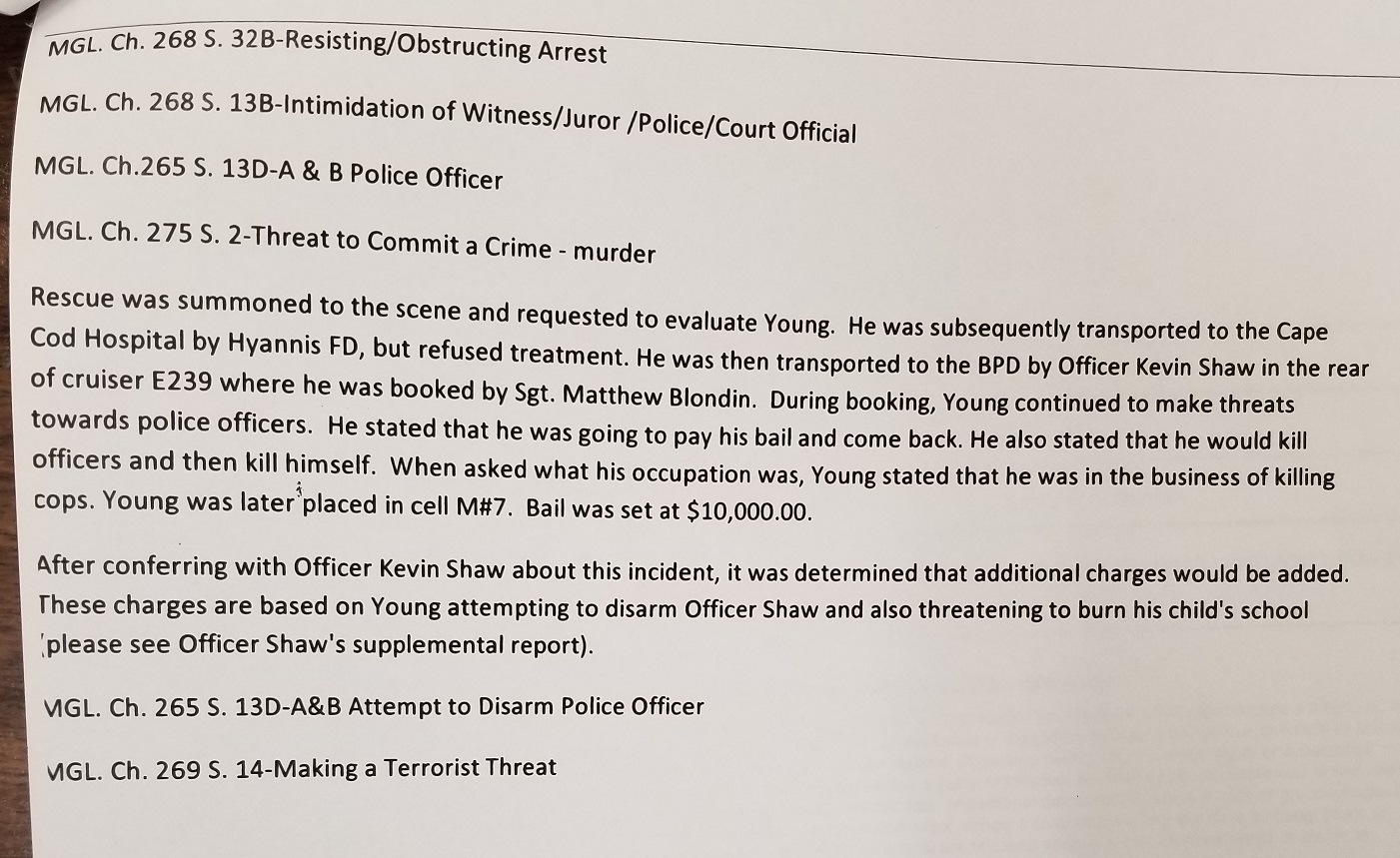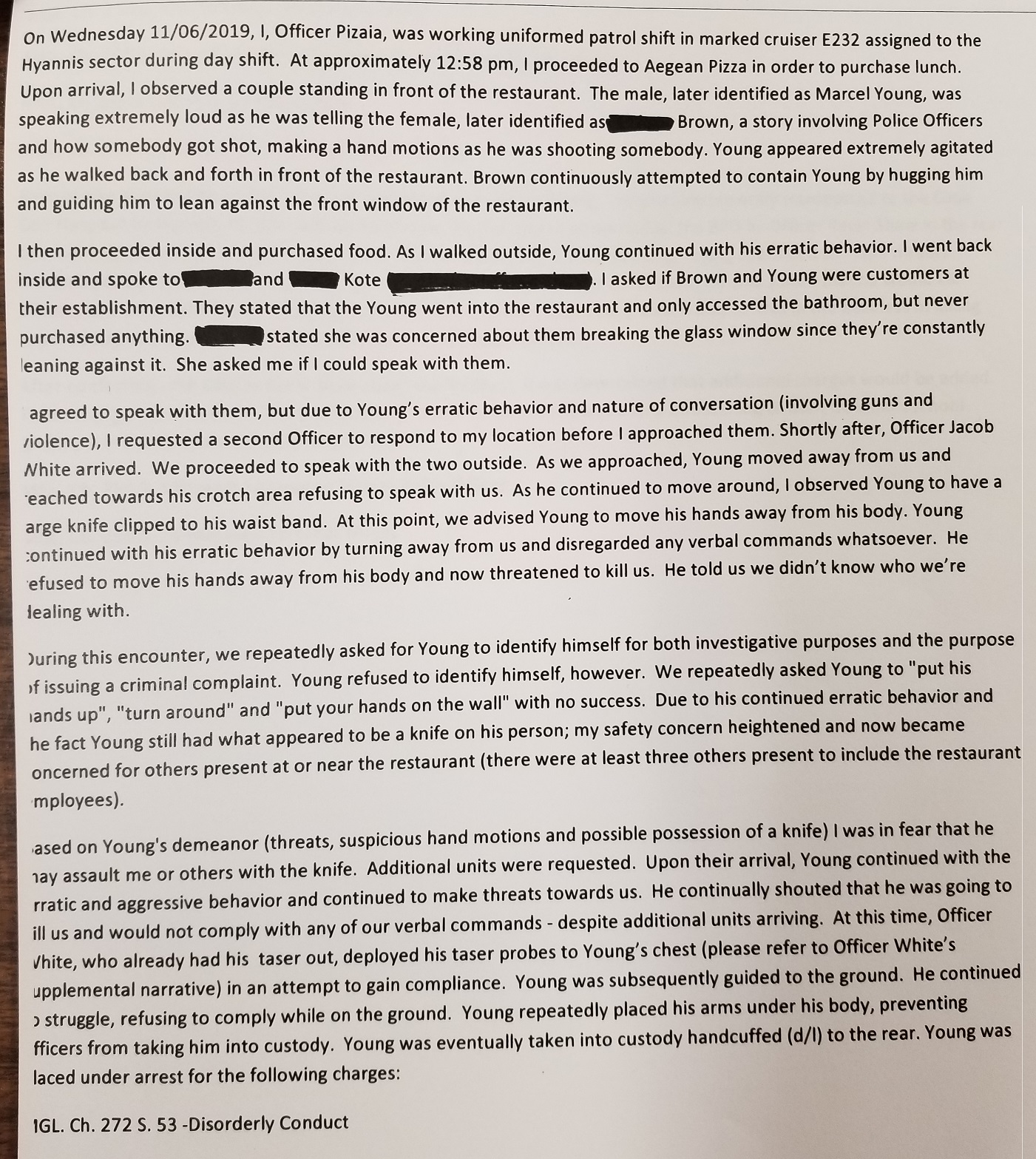 On Wednesday, November 6, 2019, Barnstable Police Patrolwoman Wanessa Pizaia was inside Aegean Pizza buying her lunch. She had reportedly observed Marcel Young, the aforementioned subject in this story, outside the restaurant speaking loudly, telling the female he was with an unsettling story involving police officers and how somebody got shot…