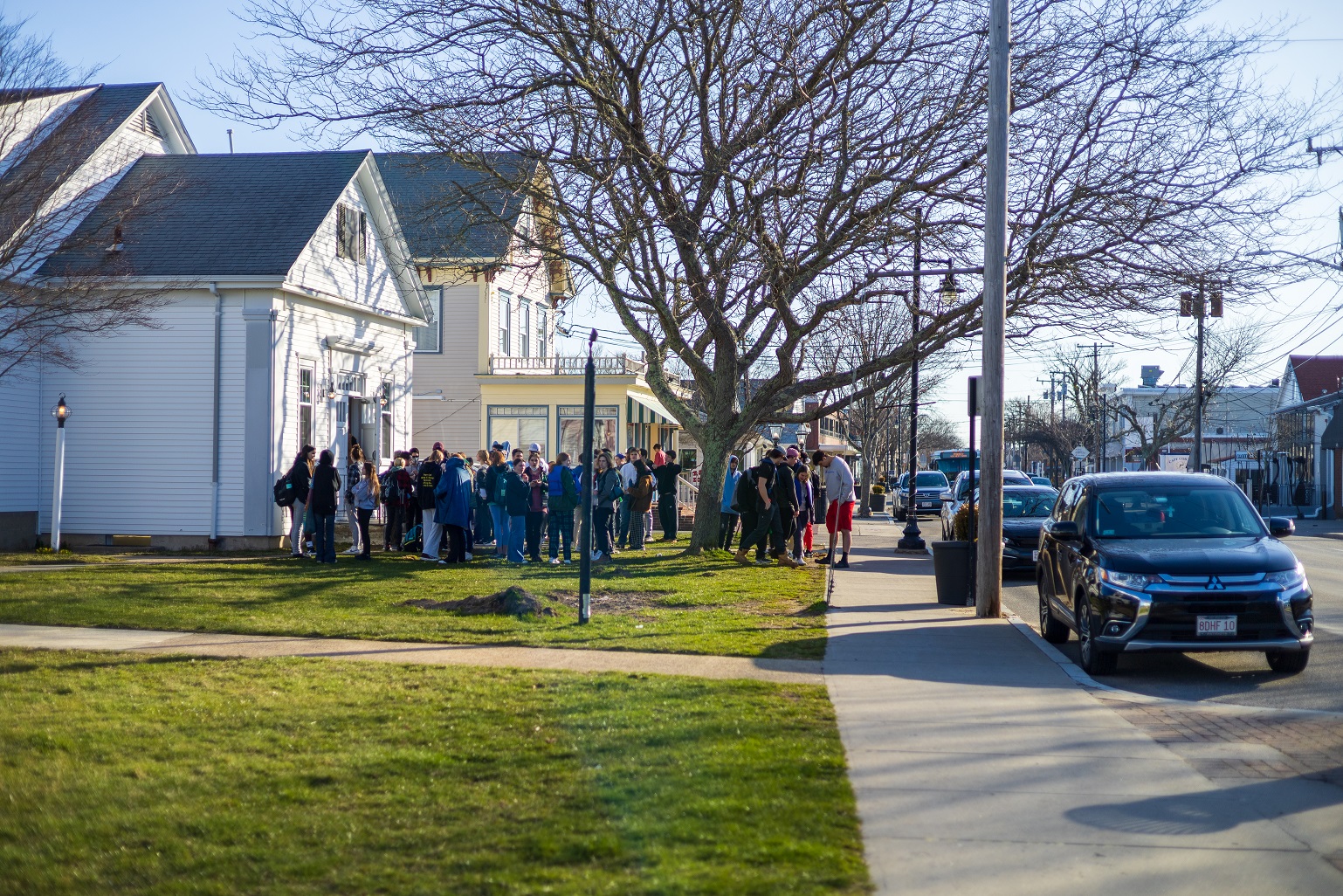 Highschoolers gather outside the First Babtist Church of Hyannis on Main Street. Several students told HN they were waiting to take exams inside… I think they were from Sturgis… nice kids…