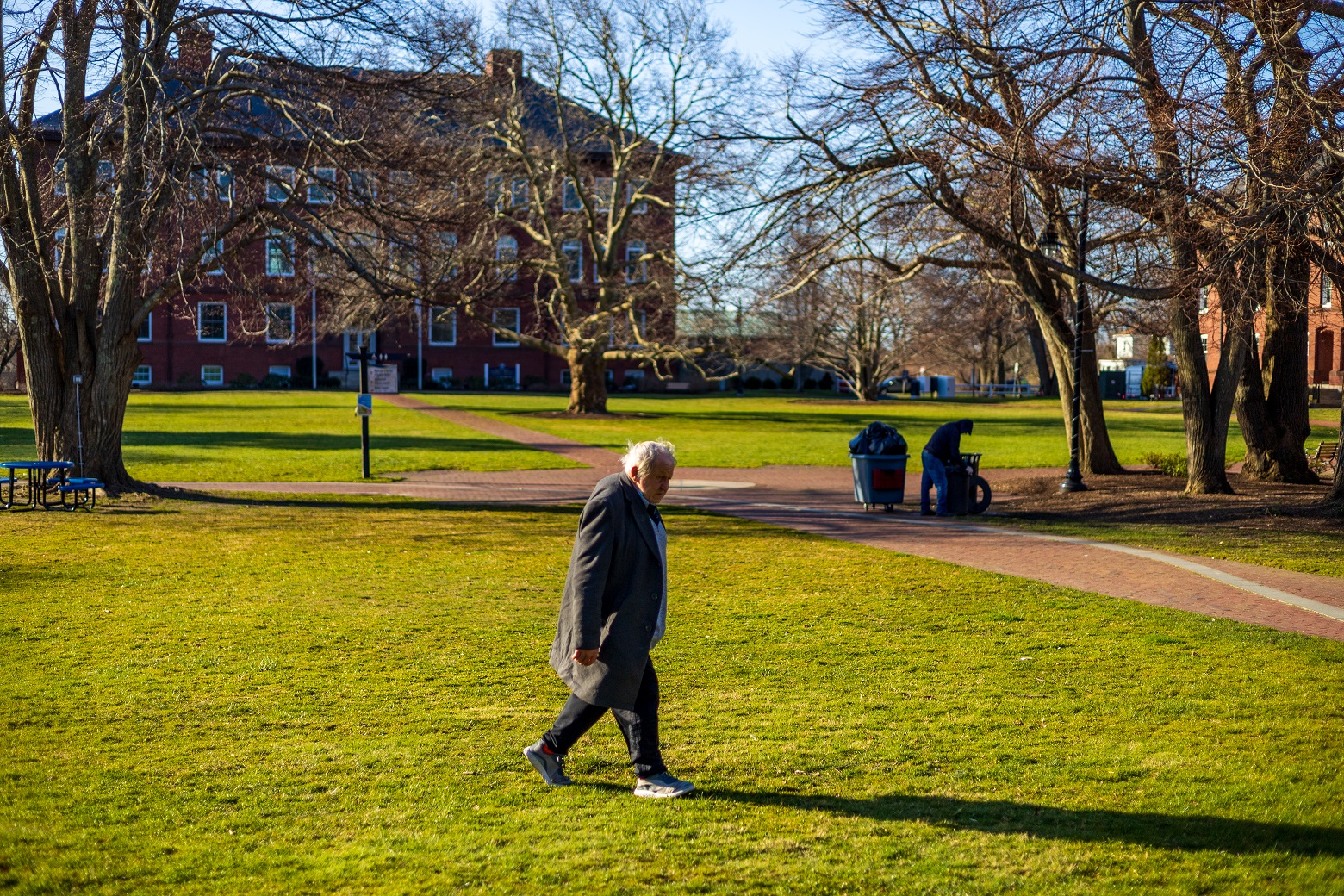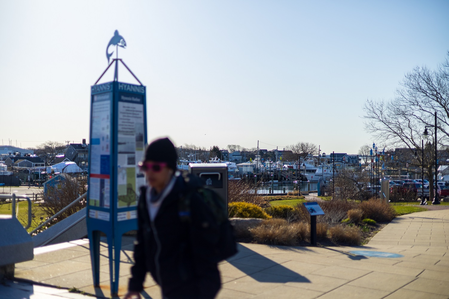 Strong morning sunshine casts long shadows on the Hyannis Village Green…