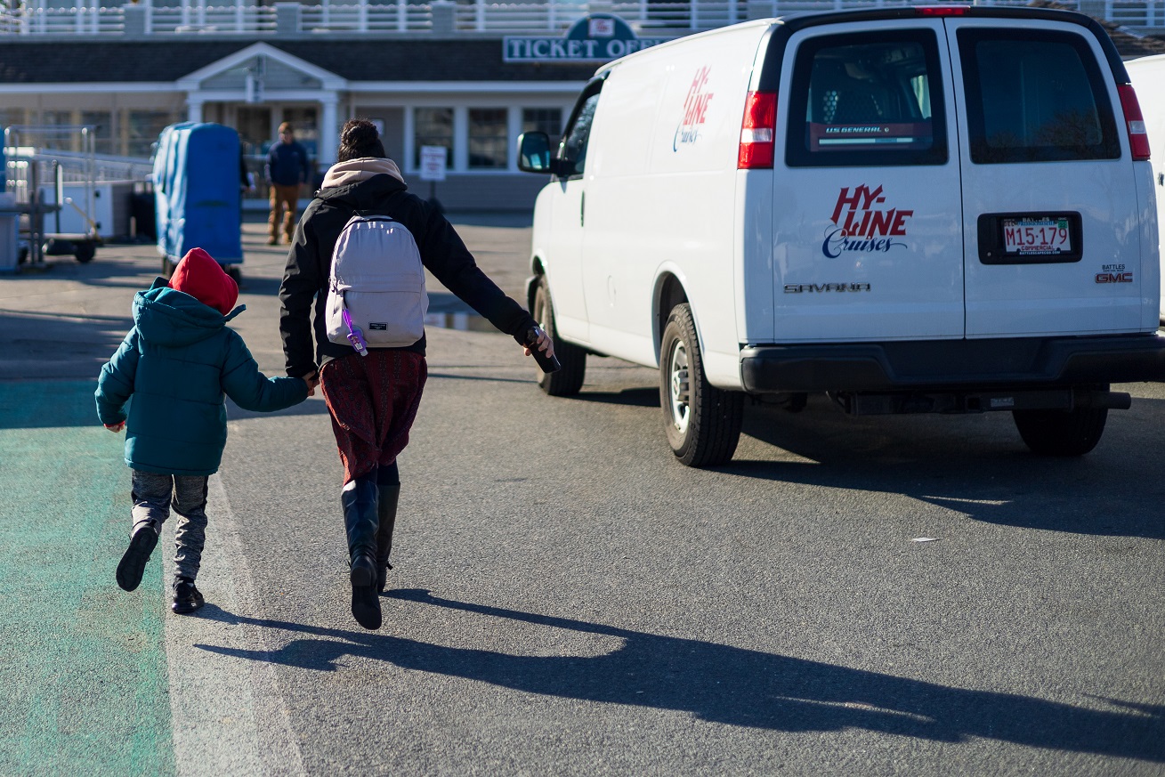 A mom and her young son hustle toward the Hyline ticket office…