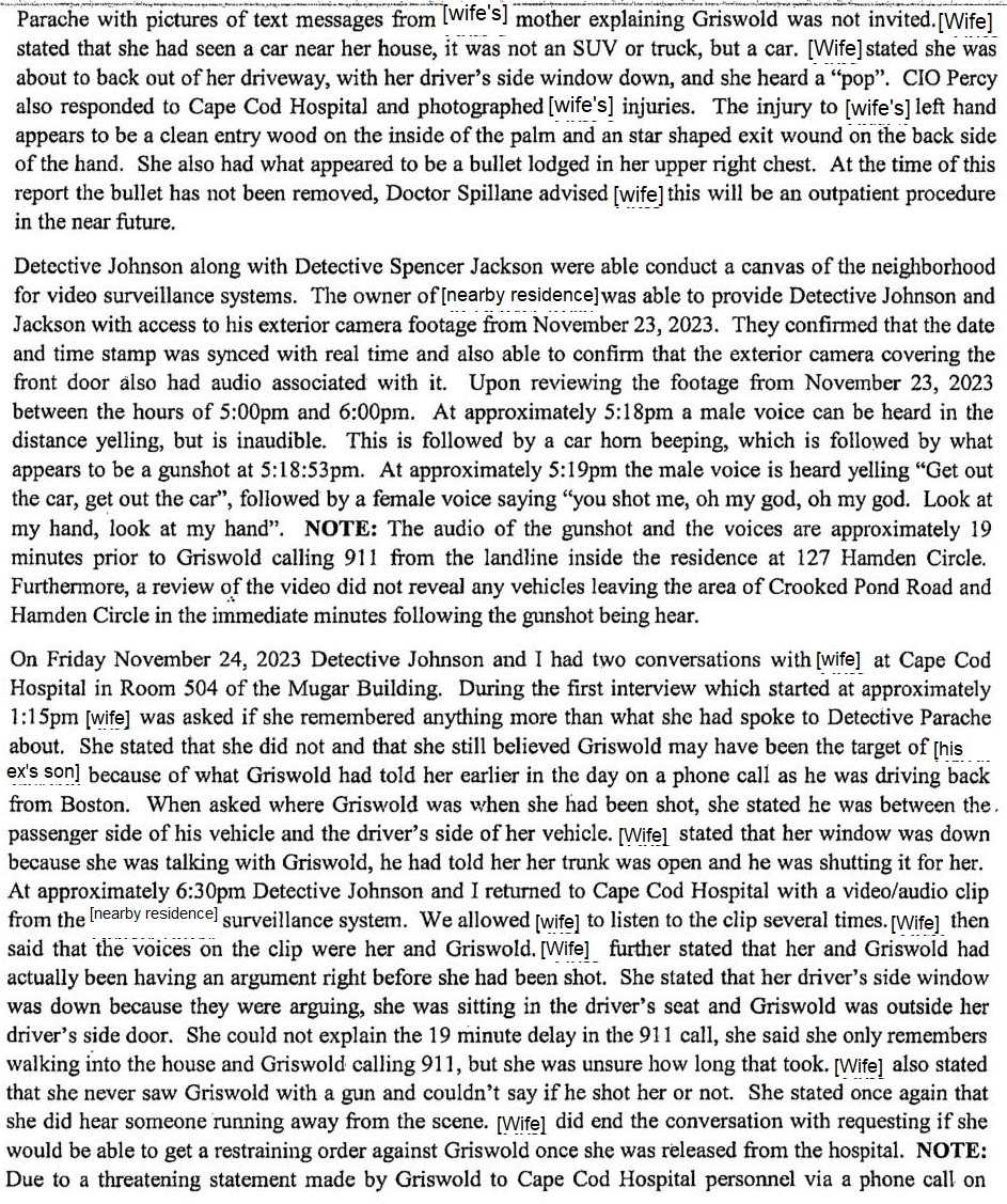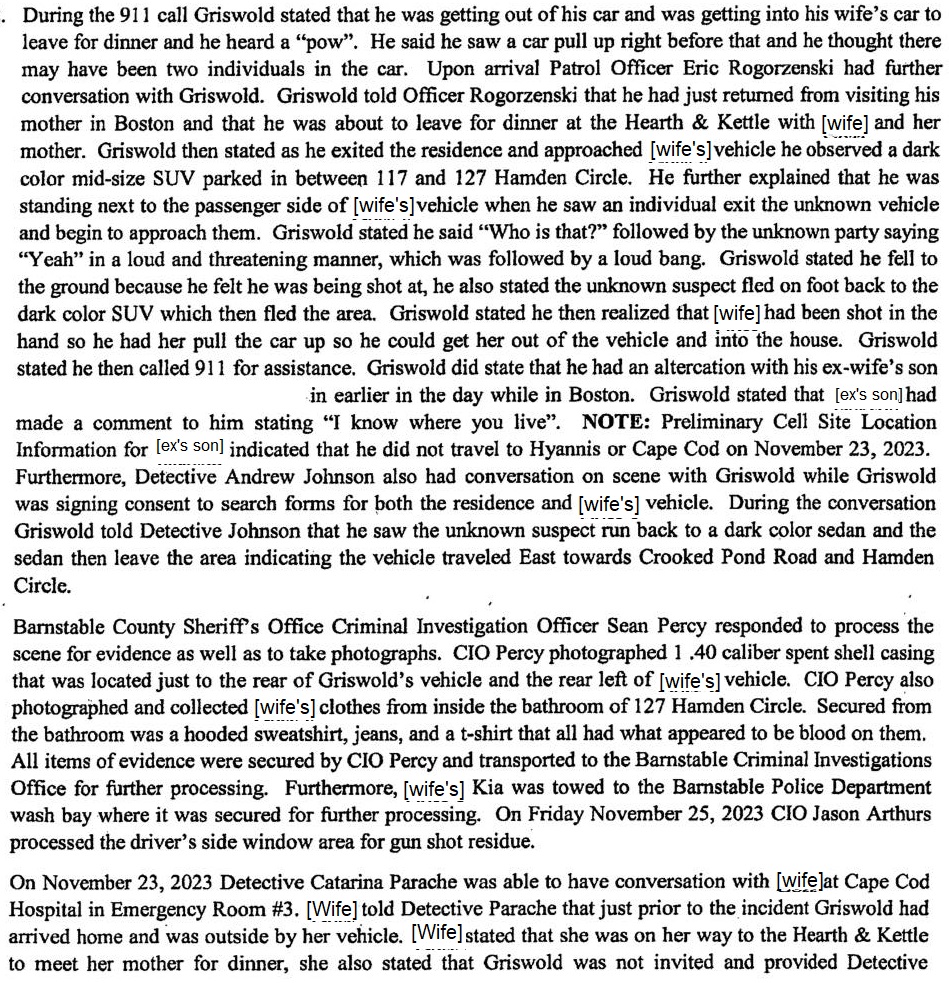 According to Barnstable Police documents filed during an arraignment in district court on Tuesday, November 28, 2023, Detective Kevin Connolly reports that on Thanksgiving at around 5:37 p.m., the Barnstable Police Department received a 911 call from 127 Hamden Circle. The call was reportedly placed by Mark Griswold who stated that someone had just shot at him and his wife… and that his wife had been hit.